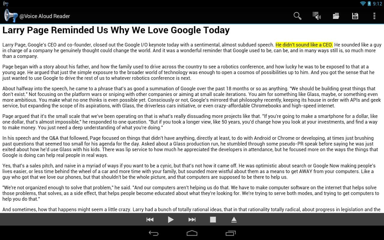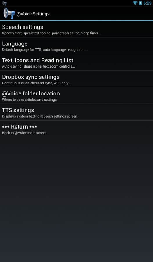 - Открытие текстовых, PDF и HTML-файлов из файловой системы Android для чтения их вслух.