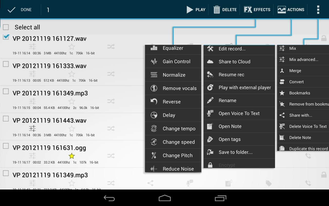 Voice PRO для андроид является не просто диктофоном, скачав эту программу Вы увидите все его возможности, большое количество функций и эффектов для применения к Вашим записям, в общем все, что угодно (редактировать, регулировать, обрезать, вставить другой фон, устранять помехи и шумы, звуковые эффекты, изменить громкость, изменять темп, объединить или смешать записи различных размеров и качества, конвертировать записи голоса в текст в более чем на 50 языках и без ограничений на размер!)