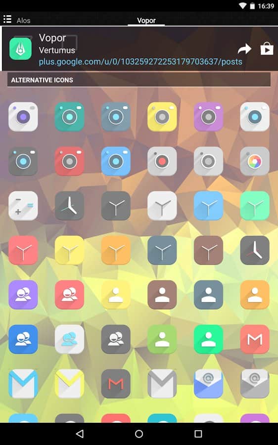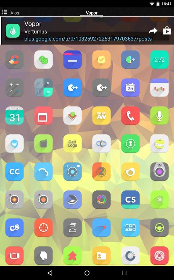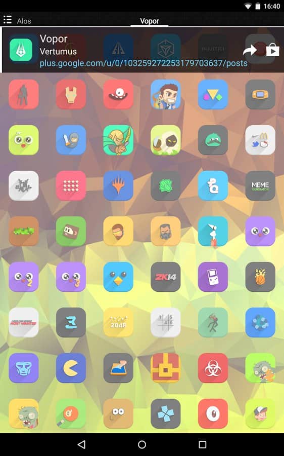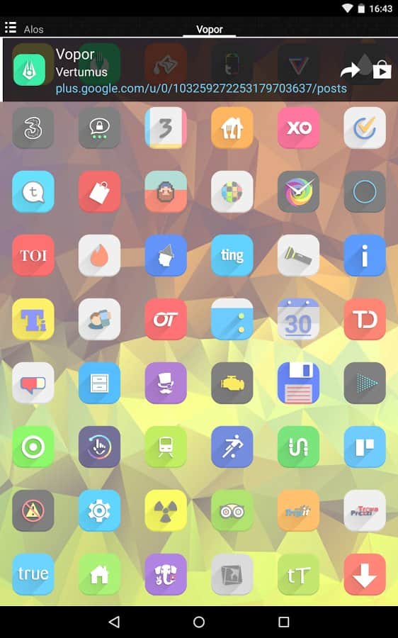 Vopor - Icon Pack - отличный сборник для вашего рабочего стола, огромный выбор красочных иконок и обоев которые обновляются ежедневно. Все они имеют отличную детализацию и качество прорисовки, выбери то что тебе нужно, из множества, будь то что то яркое, или же наоборот что то неприметное. Количество иконок в этом приложении просто поражает, и если вы считаете себя выносливым - попробуйте посмотрите их все!