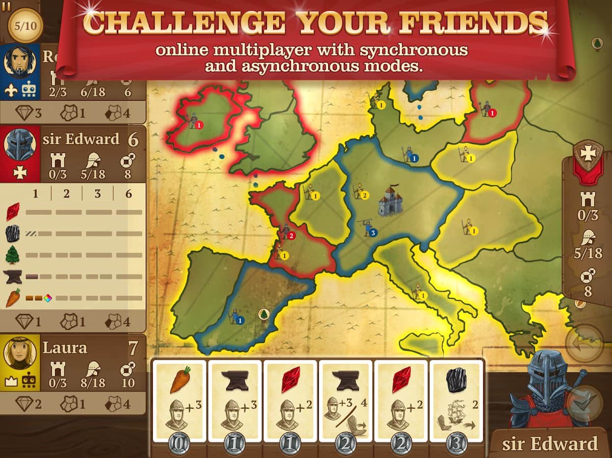 Восьмиминутная Империя (Eight-Minute Empire) – настольная игра на андроид, где вы будете строить свою империю за восемь минут. В этой игре вашей задачей будет собрать свою непобедимую армию, командовать войсками и сражаться с другими игроками уничтожая их замки. Все это вы будете делать для того чтобы ослабить своих противников и как можно лучше усилить свою империю. В эту игру могут играть одновременно от 2 до 5 игроков, которые будут выбирать карты и выполнять различные действия. Исследуйте огромную карту игры и захватывайте все больший контроль, набирая очки.
