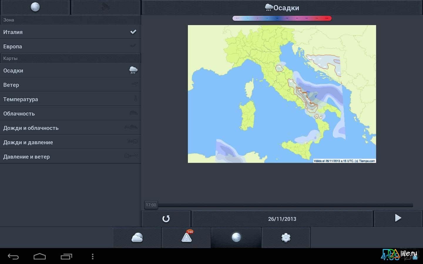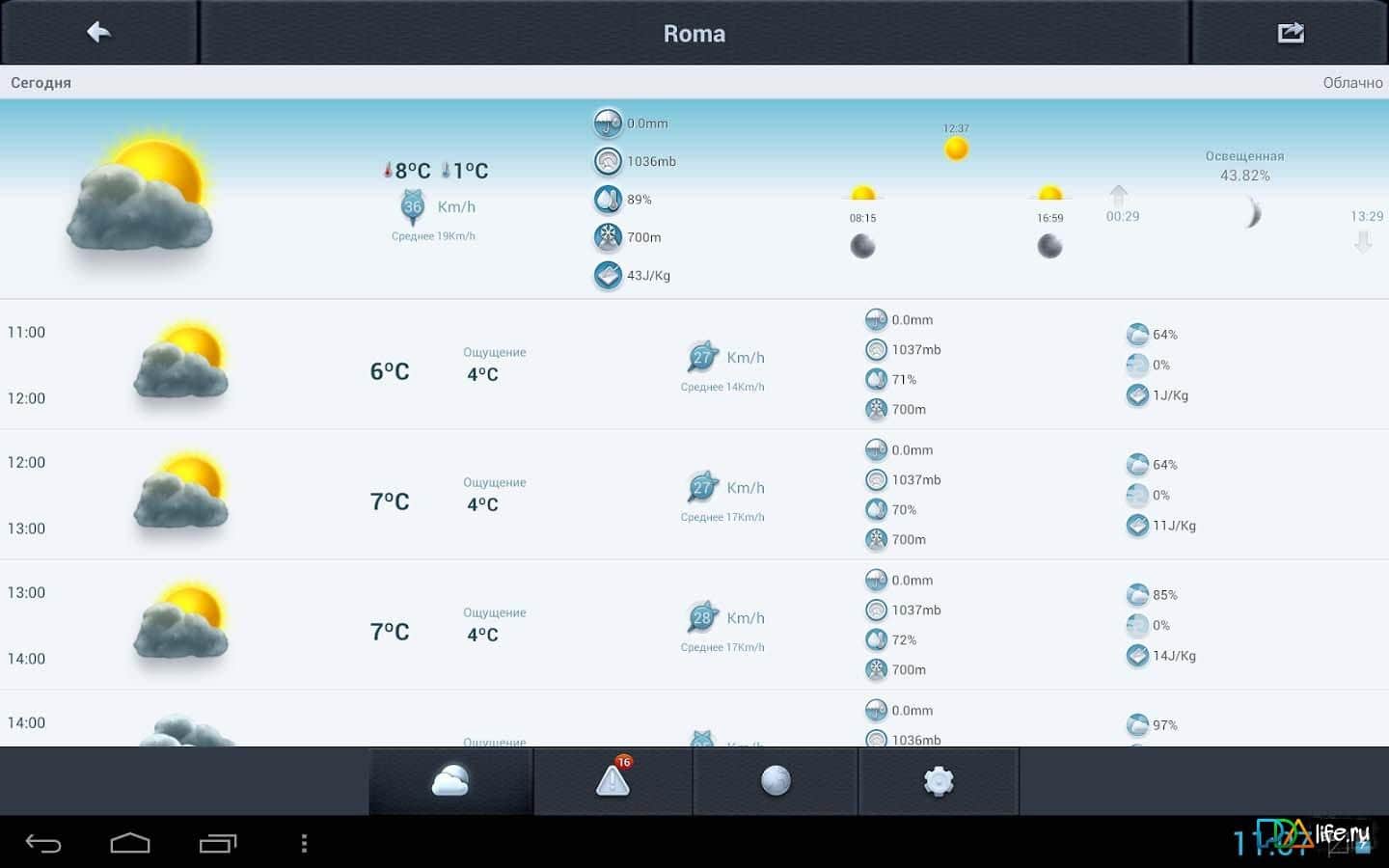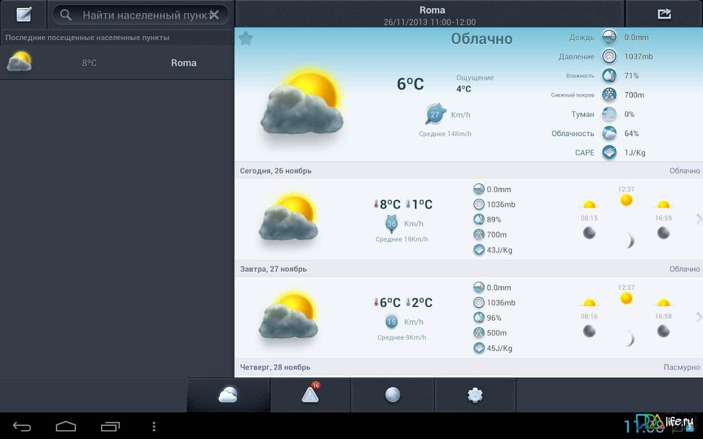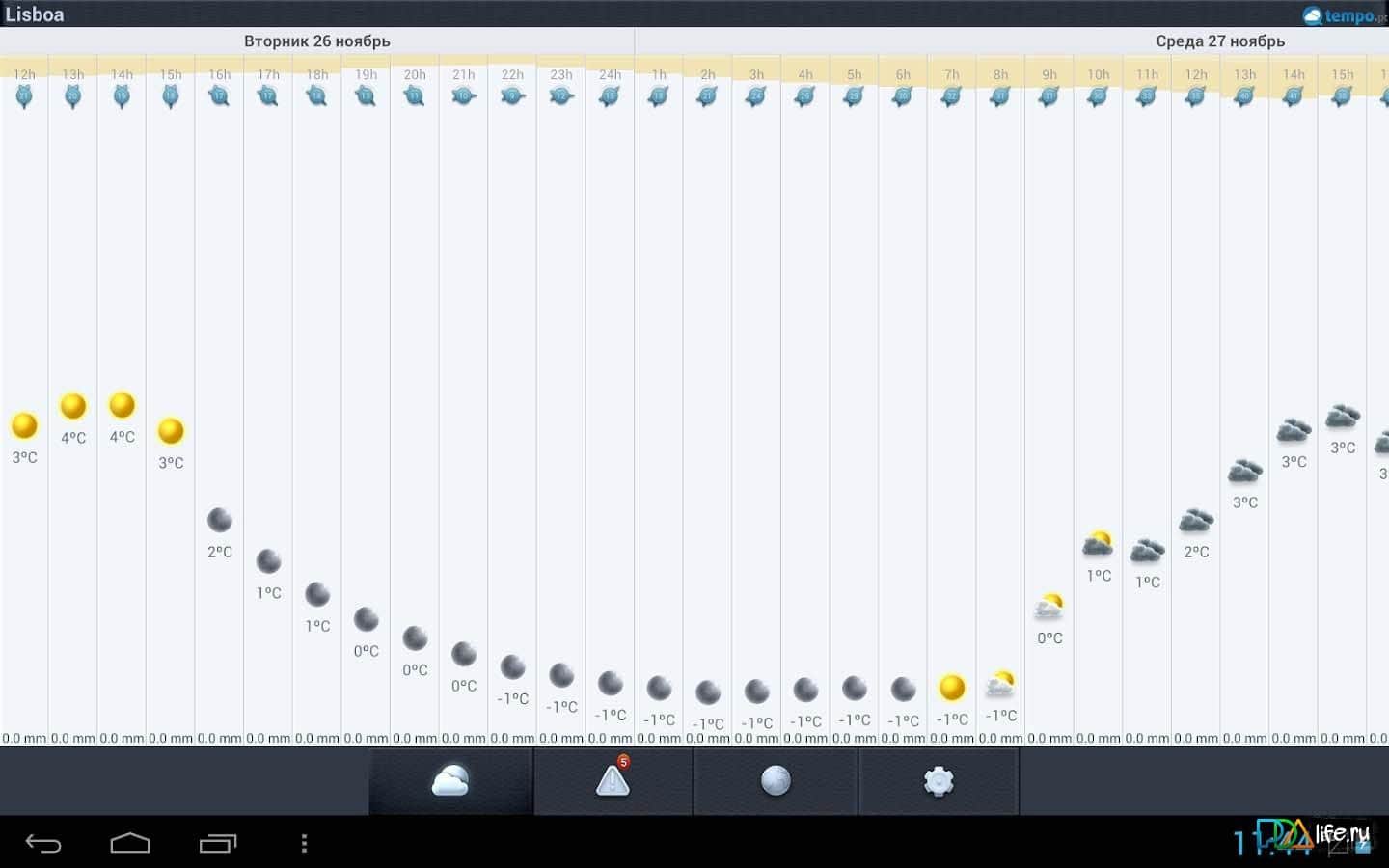 Время 14 дней – отличное приложение для андроид-смартфонов/планшетов с прогнозом погоды на 14 календарных дней и для более 200 тысяч городов мира. Приложение включает в себя подробный прогноз погодных условий на сегодня и завтра, а так же каждые 3 часа на всю текущую и следующую неделю. Кроме того с помощью данного приложения вы легко можете получить информацию о горнолыжных курортах, о восходе и закате, лунном календаре, прогнозе дождей, облачности и других не менее важных данных связанных с погодой.