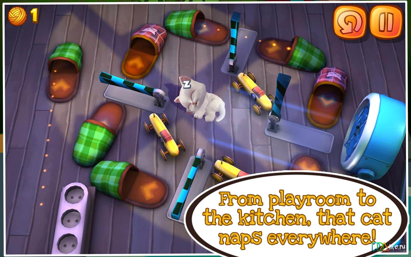 Wake the Cat - игра на андроид, основанная на физике в которой вам необходимо разбудить котенка докатив до него клубок. Для того чтобы это проделать вам в помощь придут вентиляторы, тапочки и поезд, но также учитывайте силу тяжести клубка и скорость с которой он будет катится. Вам нужно будет изрядно поломать голову чтобы пройти все уровни и заработать максимальное количество звезд.