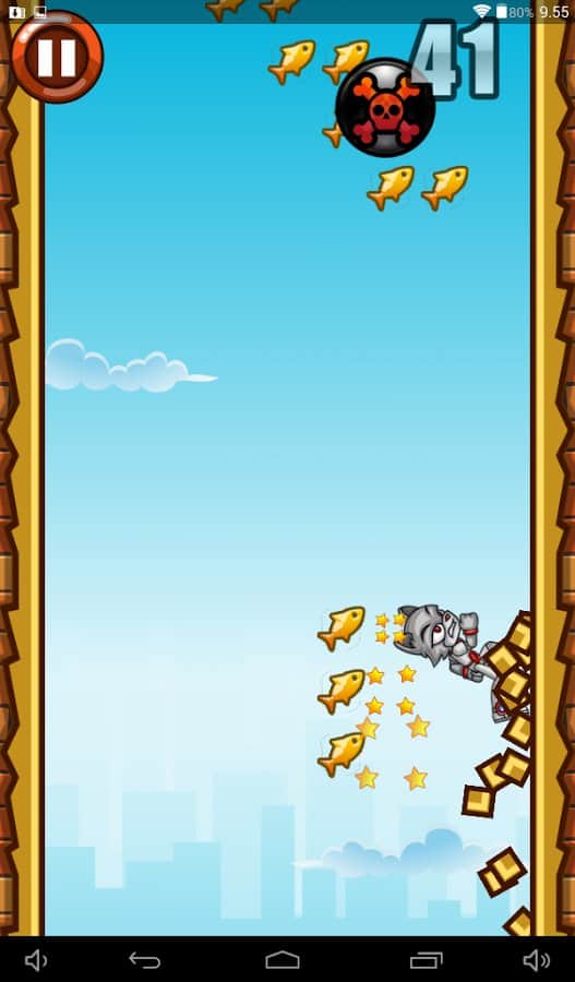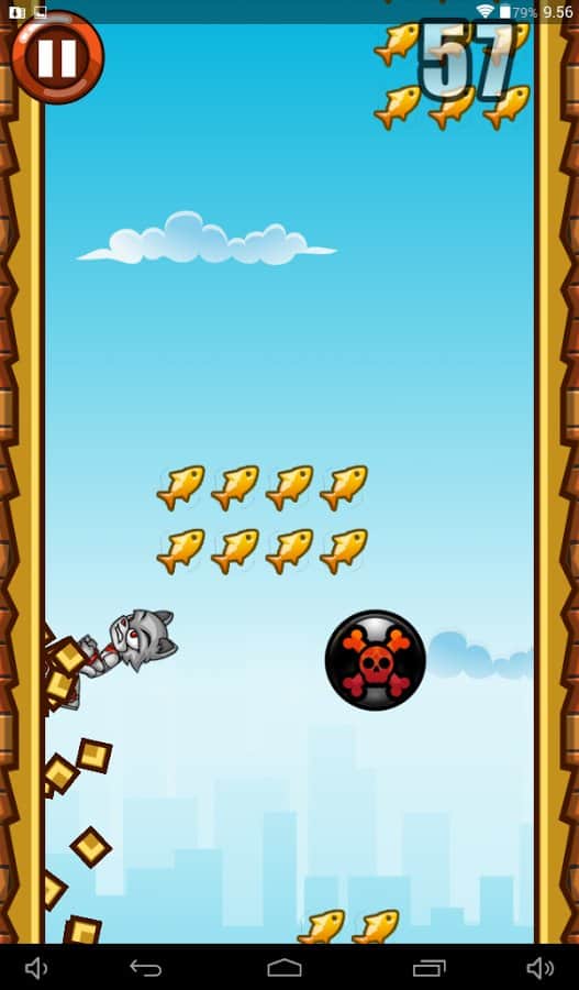 Wall Cat Run – управляйте бегом забавного кота и помогите ему взобраться как можно выше. Прыгайте с одной стены на другую и собирайте по пути многочисленные бонусы и усиления, а также не забывайте обходить стороной все преграды. Ваш кот поднимается все выше и выше и бежит на большой скорости, вовремя касайтесь экрана, чтобы он совершал прыжки. Перемещайтесь с одной стороны экрана на другую и собирайте весящих в воздухе рыбок. Помогите забавному коту избежать столкновения с опасными бомбами и другими препятствиями. Установите свой рекорд в этой игре и поднимитесь на самый верх таблицы лидеров.