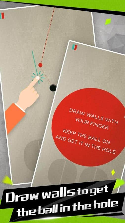 Walls and Balls – головоломка на андроид, с минималистичной графикой и захватывающим геймпеем. Эта игра гибрид таких жанров как мини-гольф и пинбол, в ней вашей задачей будет закатить шарик в лунку, рисуя на пути его следования линии. Применяйте свою отличную реакцию и скорость пальцев и рисуйте многочисленные линии, если с первого раза не получилось закатить шарик. Применяйте многочисленные бонусы и увеличивайте свои шансы на победу в этой игре. Вас ждут многочисленные и разнообразные уровни, где вы будете закатывать шарики в лунку. Проходите множество сложных уровней и установите свой рекорд, в этой игре добиваясь отличных результатов.