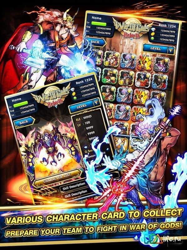 War of Gods : Rebirth – карточная игра с элементами RPG на андроид, где вам предстоит дать отпор мощным богам. В далекие времена на земле правили боги и вершили суд с помощью наводнений, землетрясений, ударов молнии и пожаров. Духи земли потеряли свою жизнеспособность после таких разрушений, и баланс сил вышел из строя. Теперь настало время героям вступить в неравный бой против богов. Выбирайте себе понравившегося героя и дайте отпор богам, восстанавливая баланс в мире. Улучшайте ваших героев и соберите огромную команду, участвуя в эпических битвах с монстрами и богами. Увеличивайте свою силу и бросьте вызов другим игрокам в PVP арене, завоевывая множество наград.
