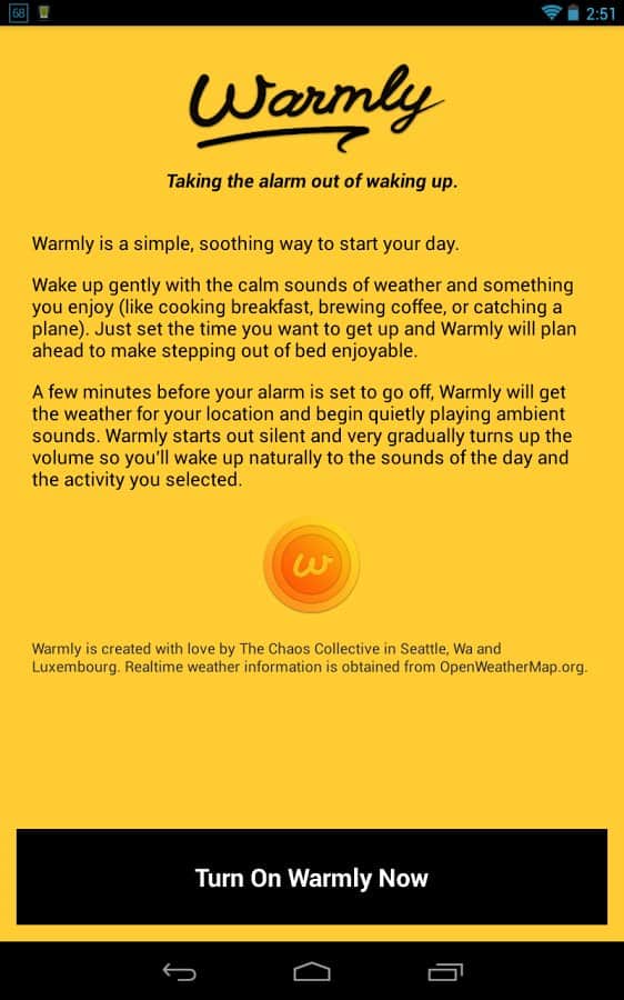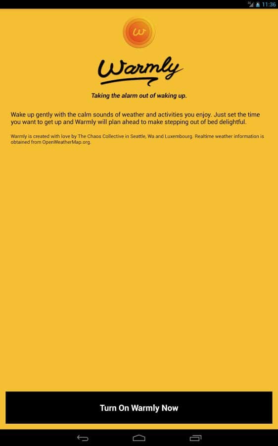 Warmly — An alarm clock для андроид от разработчика The Chaos Collective. Установите данный будильник на свой смартфон и проблема просыпания на работу, по делам, на встречу и т.п. будет решена. Начните свой день с позитива. Приложение весьма просто в управлении и содержит ряд особенностей и возможностей, из которых: 12-часовой и 24-часовой режим поддержки, 9 треков активности звука, постепенно нарастающая громкость, прогноз погоды на утро и многое другое.