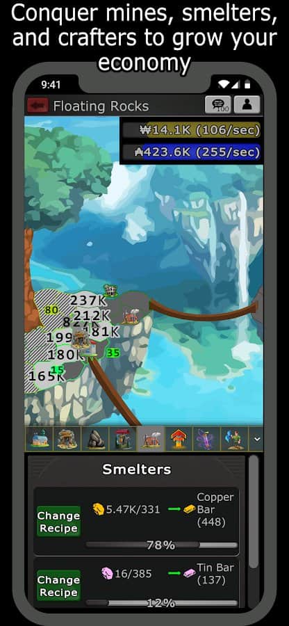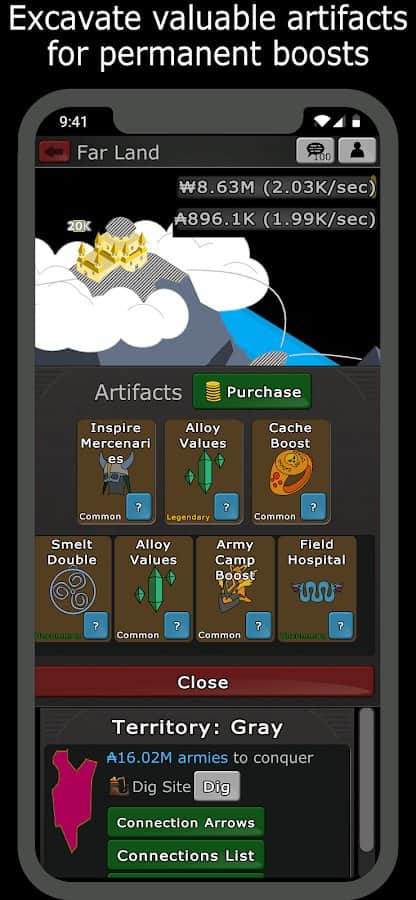 Пока другие спят, отправляйтесь покорять целый мир! В Warzone Idle у вас будет своя территория и армия, но вы все равно хотите получить большего. Отправляйтесь в походы, находите интересные предметы, улучшайте рудники и добывайте оттуда руды, создавайте заводы и плавьте их, чтоб потом дорого продать, открывайте новые ремесла с помощью рецептов, находите сокровища, нанимайте армию, модернизируйте перевозные больница, участвуйте в боях на аренах, находите артефакты, завершайте удачные атаки на определенных странах и получайте опыт.