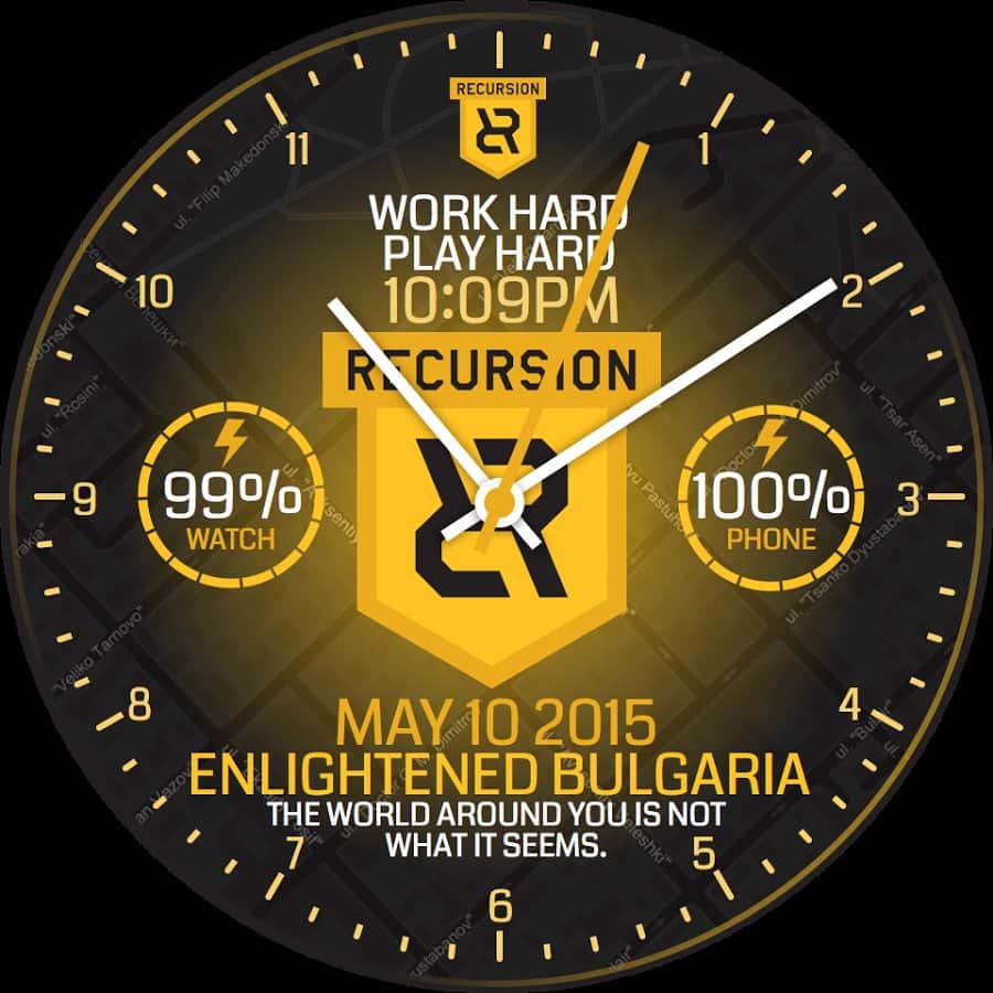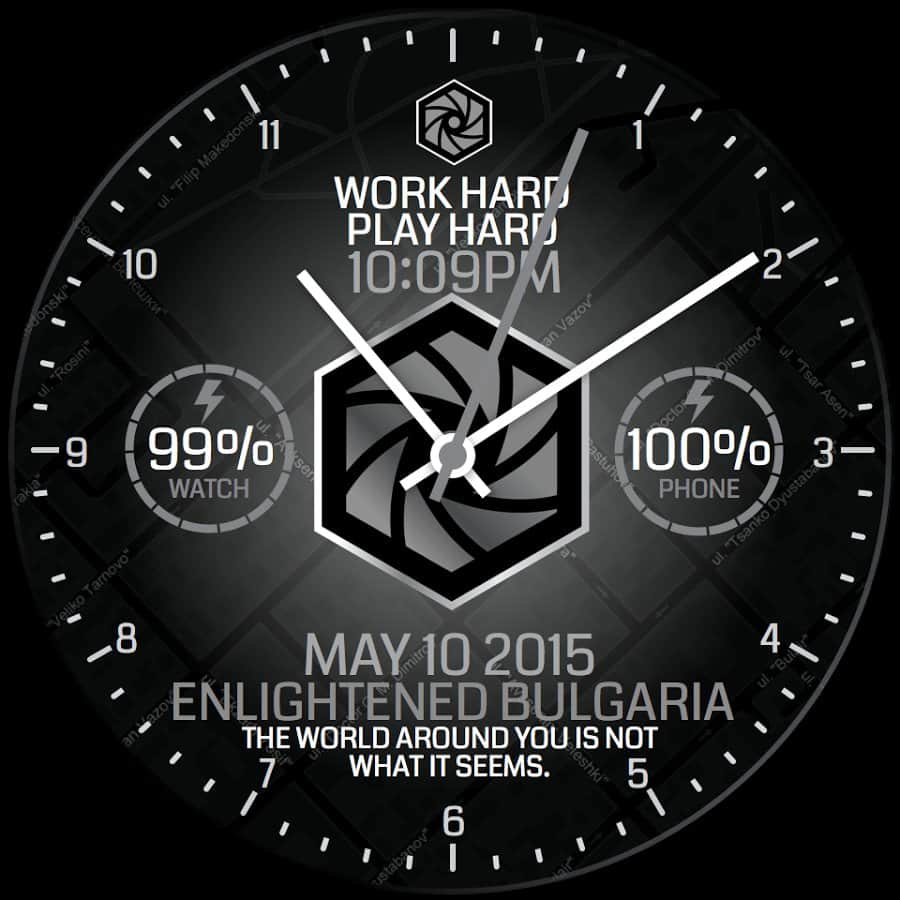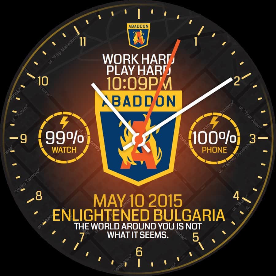 Вочфейс полностью оформлен в стиле вышеупомянутой игры, а в настройках вы сможете добавить ему индивидуальности: подобрать фон, цвета, отображение необходимой информации, формат времени и даже текст, который будет отображаться на экране.