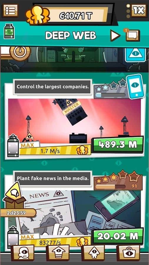 We Are Illuminati - Conspiracy Simulator Clicker - довольно оригинальный аркадный кликкер в котором вам предстоит выступить в роли члена международной организации мечтающей захватить мир. При этом вам необходимо будет воздействовать на умы человечества по средствам музыкальных клипов, статей, химических веществ в еде и воде и прочих глобальных средств. Так же у вас будет возможность использовать участие знаменитостей в своих планах. Игровая механика проекта выполнена по принципу классического кликкера, однако присутствуют и элементы экономической стратегии.