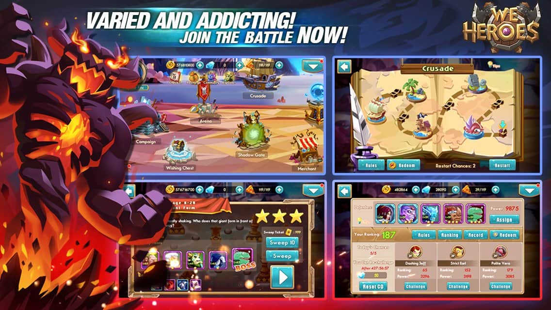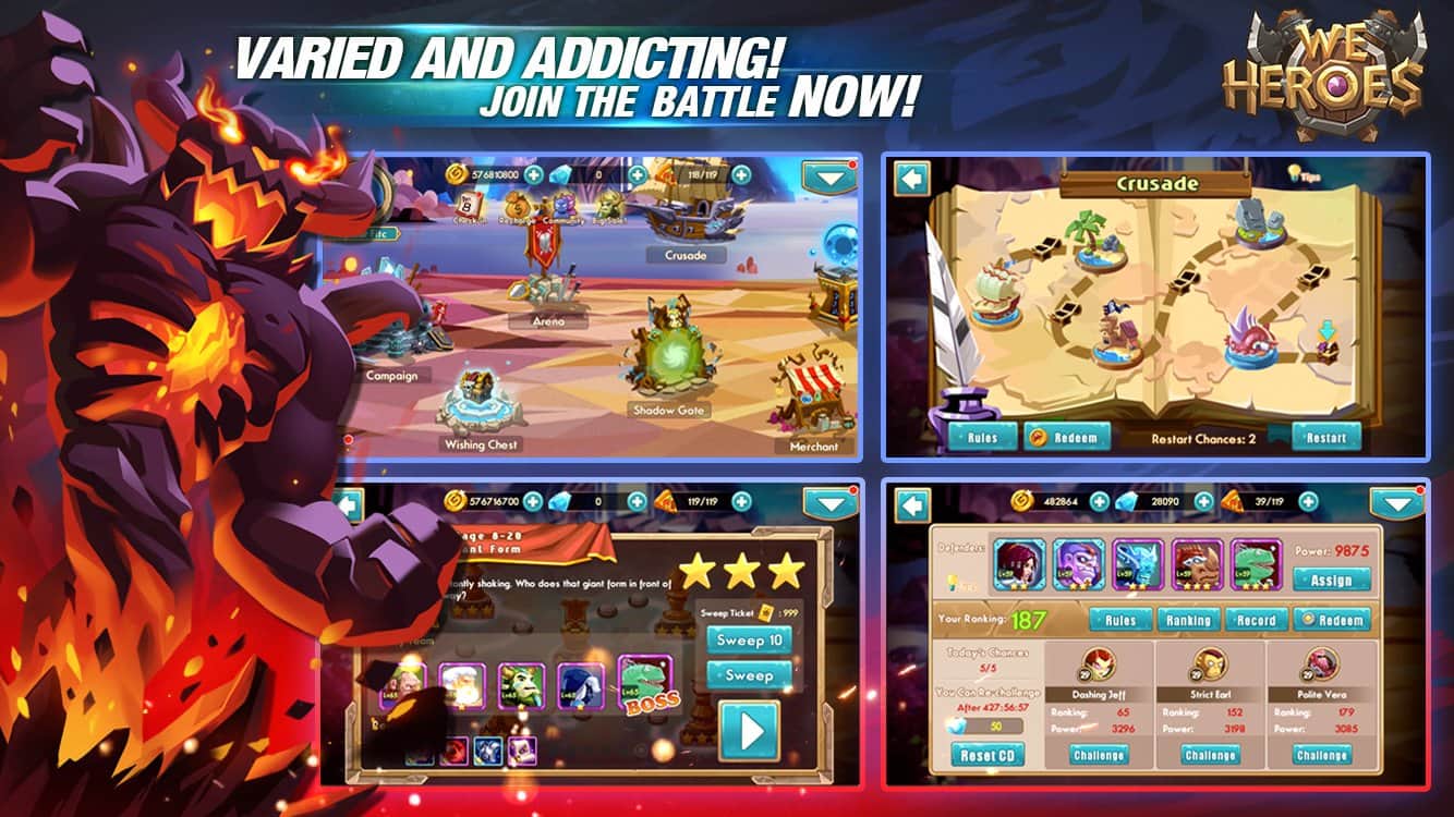 We Heroes - Born to Fight - ролевая игра, но вам не придется исследовать бесконечные подземелья или бродить по бескрайним просторам королевства, а все что вам предстоит делать это сражаться. Сами бои выполнены в стиле стенка на стенку, на игровом поле с разных сторон расположены команды соперников, состоящих из различных классов героев, каждый из которых обладает своими уникальными свойствами и навыками. Но это далеко не все, как уже отмечалось We Heroes - Born to Fight для Андроид это все таки ролевая игра, а значит каждого героя можно улучшать и развивать.