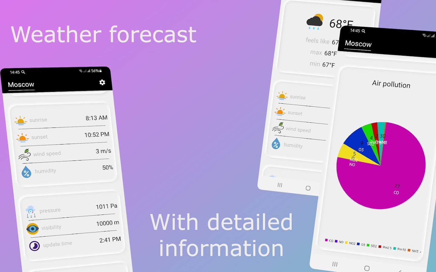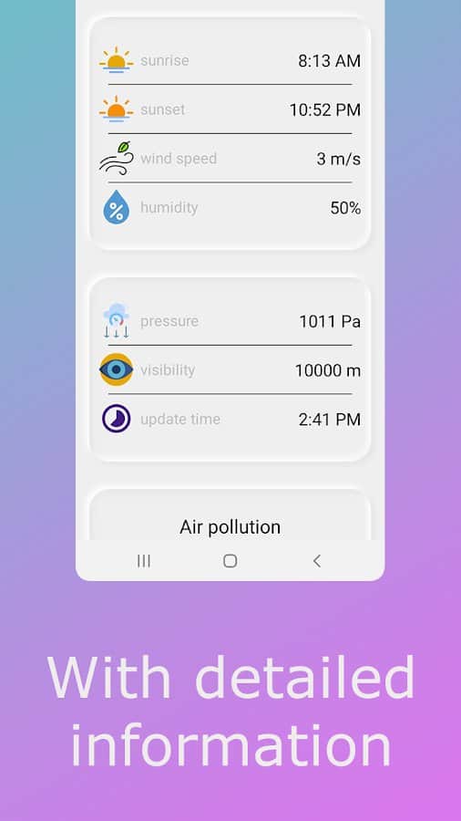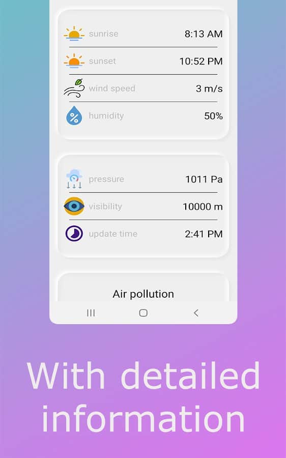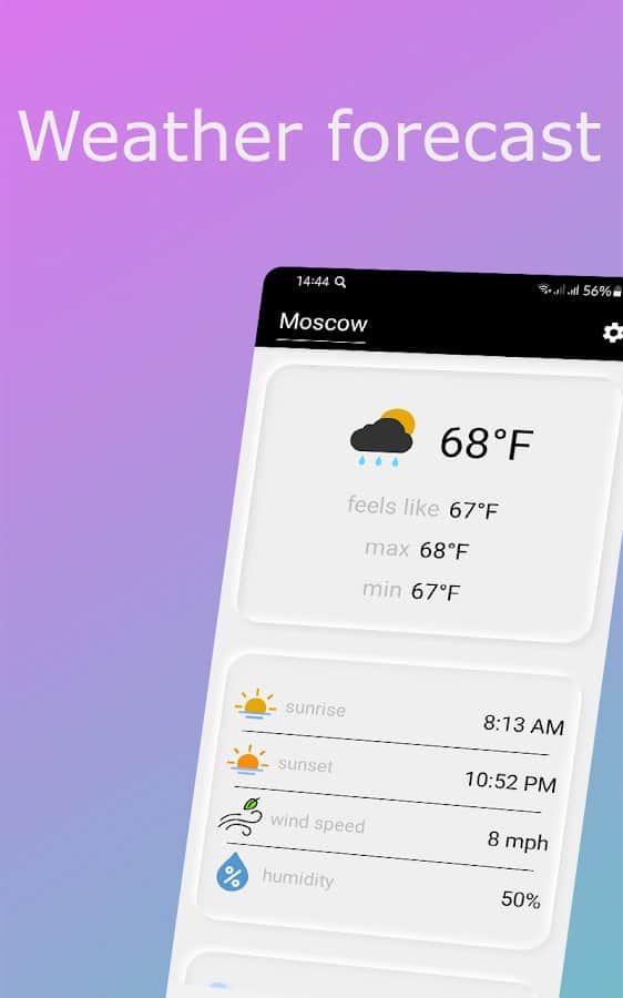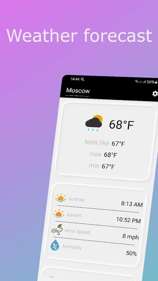 Weather - сейчас невозможно представить планирование дальнейших планов или выхода на улицу без просмотра погоды. Такая вещь имеет большое количество нюансов: влажность воздуха, почасовая смена температуры, сила ветра, возможность различных осадков и прочее. Теперь у вас будет возможность просматривать всю эту информацию в одном месте и в любое время! Наблюдайте за постепенной сменой погоды определенного времени и первым узнавайте, что вас ждет через несколько часов или на следующий день. Укажите свой город и облегчите жизнь.