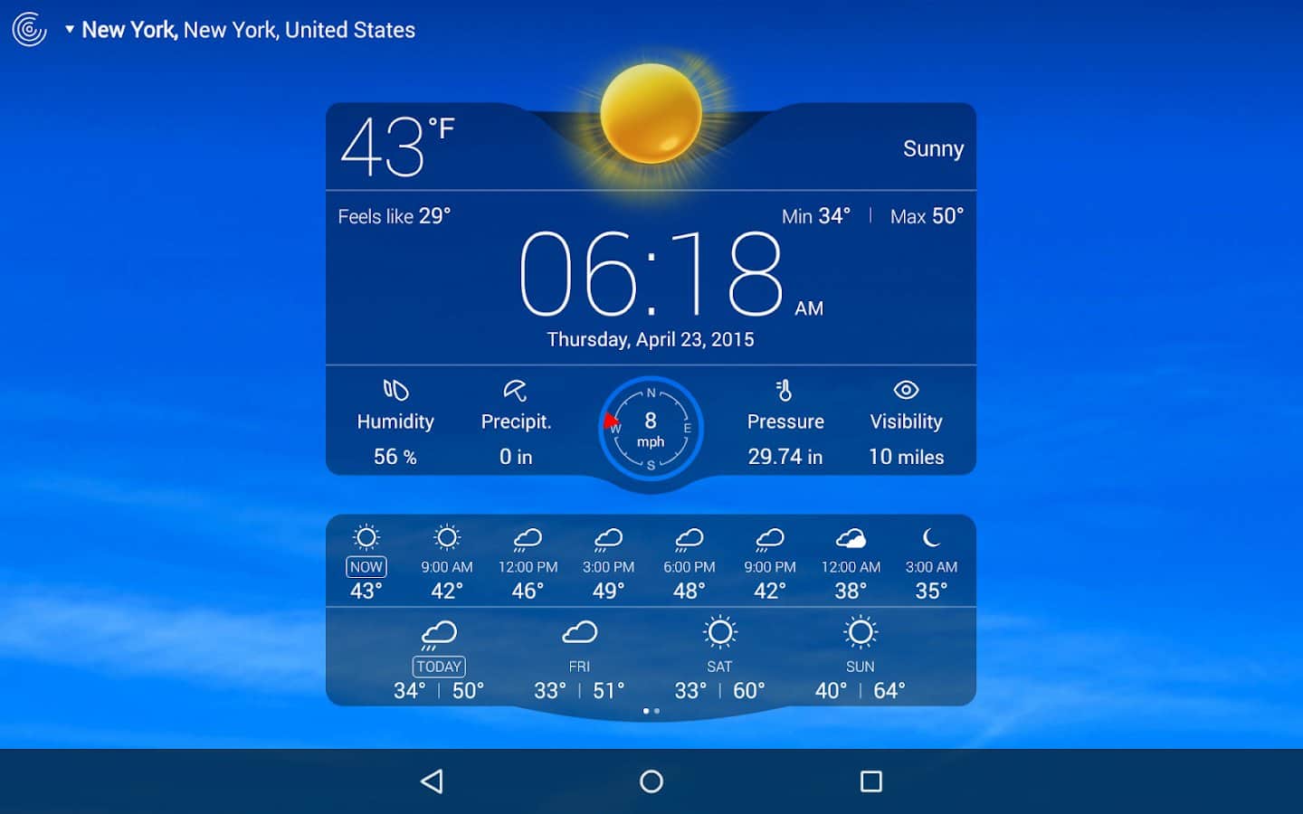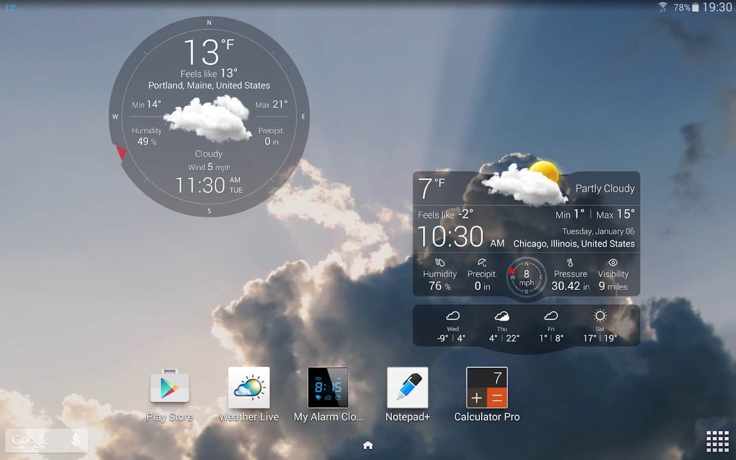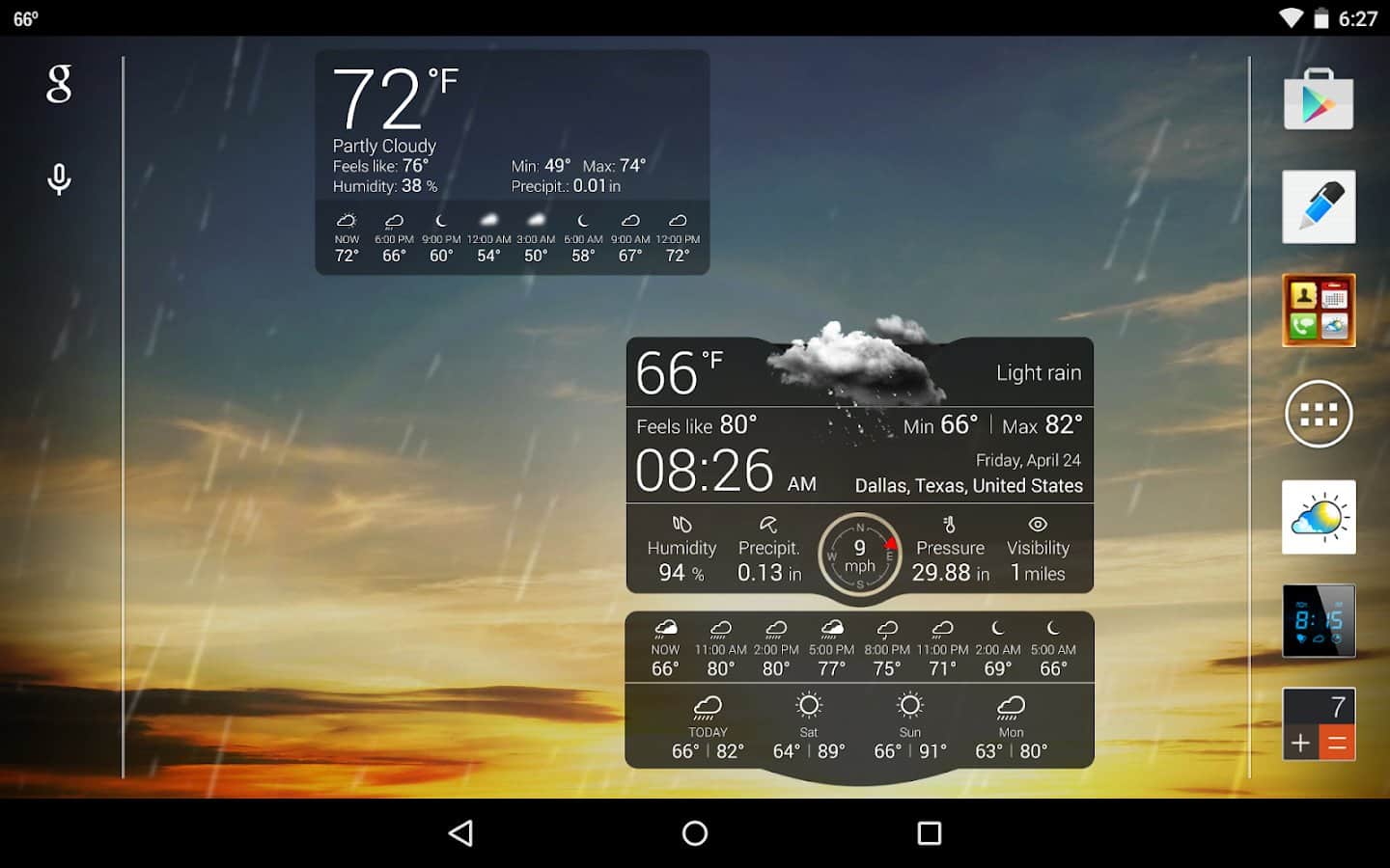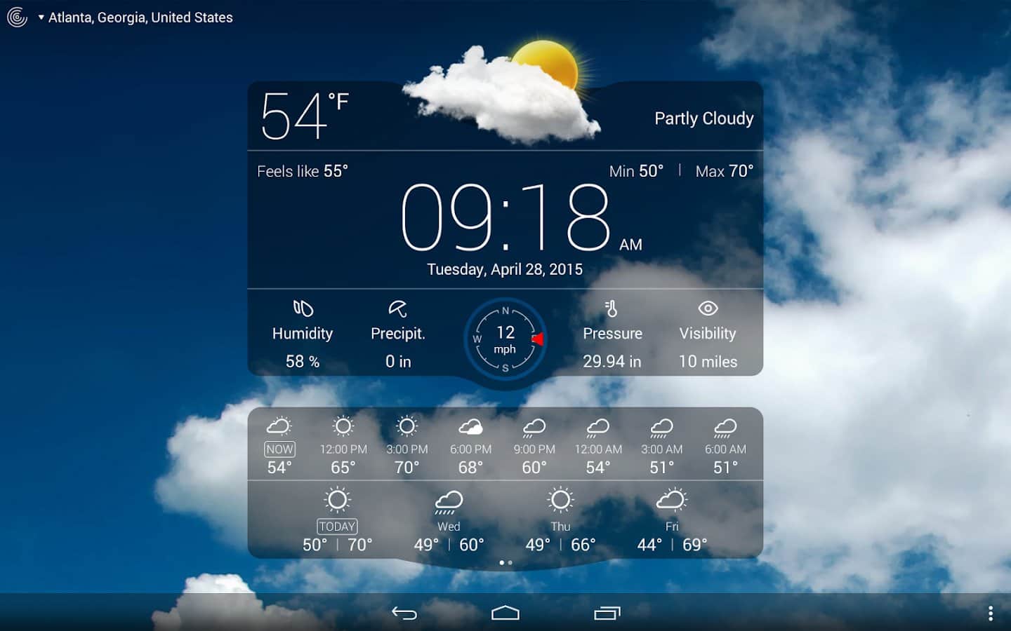 Погода Live – красивый виджет прогноза погоды для вашего андроид смартфона или планшета от разработчиков Apalon. Великолепная анимация отобразит на вашем устройстве погоду за окном, а так же по вашему запросу погоду в любой точке мира. Приложение выдаст вам данные о погоде на 7 дней вперед, покажет температуру "по ощущениям", направление и скорость ветра, видимость на дороге и многое другое. Будьте в курсе погоды за вашем окном еще лежа утром в кравати.