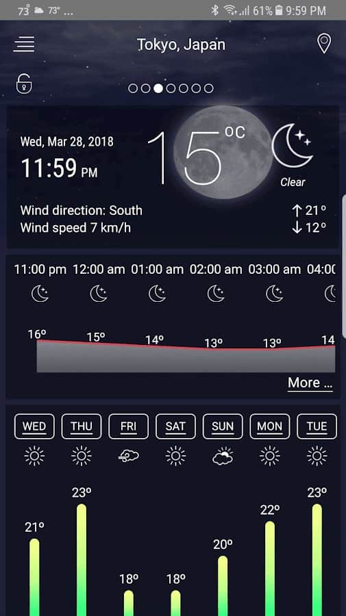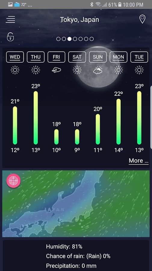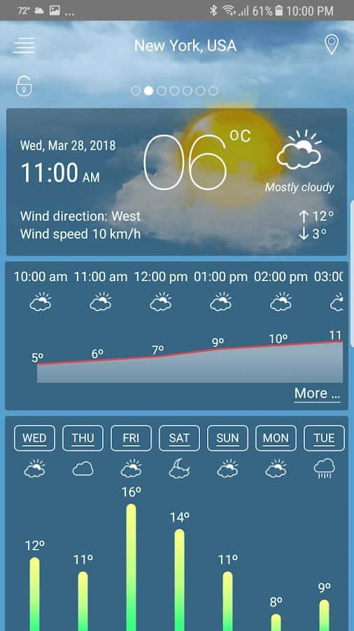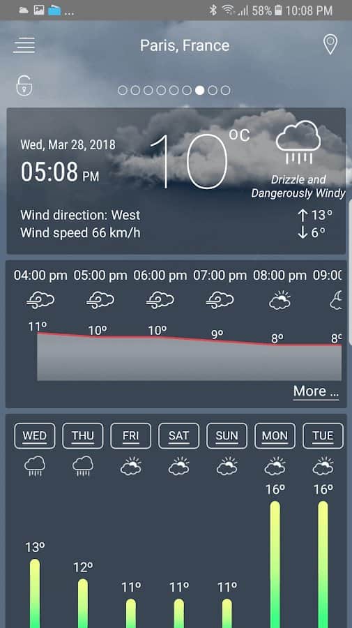 Weather Live Pro пригодится всем людям, желающим всегда быть в курсе актуального прогноза погоды. Зная правильный прогноз погоды на следующий день, можно заранее определиться с выбором наряда, понять, стоит ли брать с собой на работу тяжелый зонтик и, к примеру, выяснить, пора ли предлагать друзьям устроить пикник на свежем воздухе или придется немного повременить с этой затеей. Установив данное приложение, вы избавитесь ото всех проблем, связанных с ошибочными прогнозами, которые часто передают по телевидению и по радио. Узнавайте точный прогноз на текущий момент времени или на завтра, а также прогноз погоды на всю неделю вперед, чтобы иметь возможность заранее распланировать свои дела на ближайшие дни.