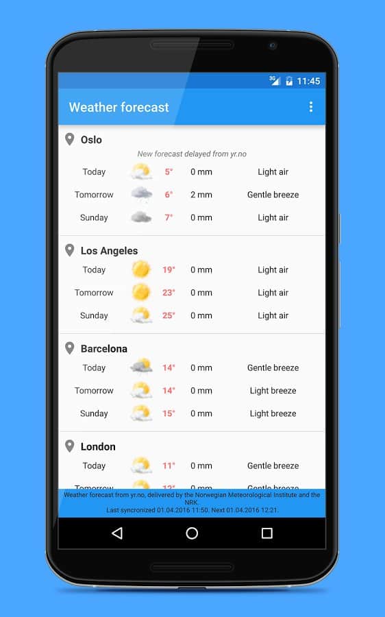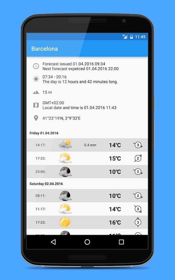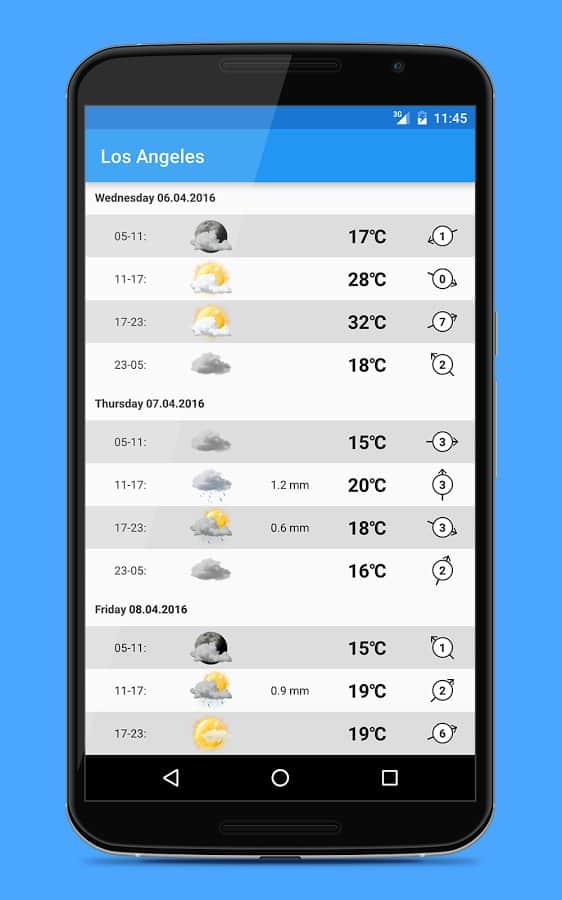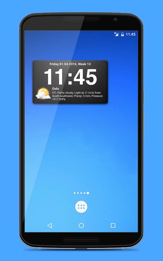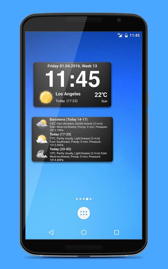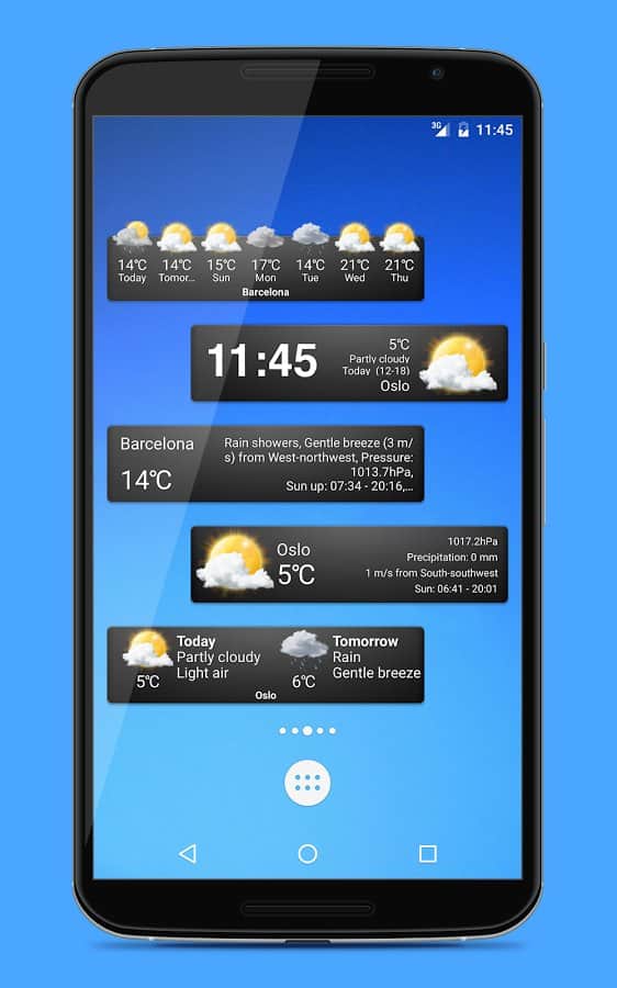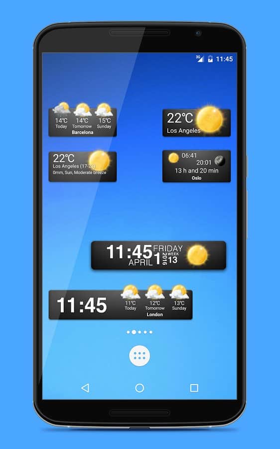 Weather Widgets - 18 виджетов в 3-х различных размерах. Прогноз погоды содержит информацию на 9 дней вперёд и разбита на 4 периода за сутки, для более точных данных. Приложение умеет автоматически находить ваше местоположение и показывать погоду в нудном вам городе.