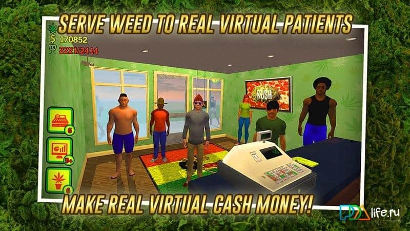 Weed Shop The Game - Великолепная игра на андроид, в которой вы поживете жизнью растамана, который открыл свой магазин, и начал торговать травкой. Кроме этого, у вас есть возможность ее выращивать, следить за ростками, и открывать новые сорта. Улучшайте и модернизируйте свой магазин, покупайте новые атрибуты, и удовлетворяйте веселых клиентов.