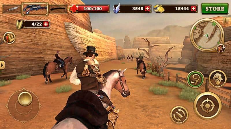 West Gunfighter – увлекательный экшен на андроид, где вы перенесетесь в мир Дикого Запада. В этой игре вы будете выступать в роли ковбоя, одинокого, бесстрашного и опасного. Возьмите в руки револьвер и исследуйте разнообразные локации, ища себе развлечение по душе. В игре вы сможете выполнять различные задания и миссии вы даже сможете выбрать себе роль, в игре становясь преступником грабя и убивая всех вкруг или благородным рыцарем спасая невинных людей и уничтожая преступников. Приобретайте различные ковбойские костюмы для героя, играйте в блэкджэк или участвуйте в дуэлях.