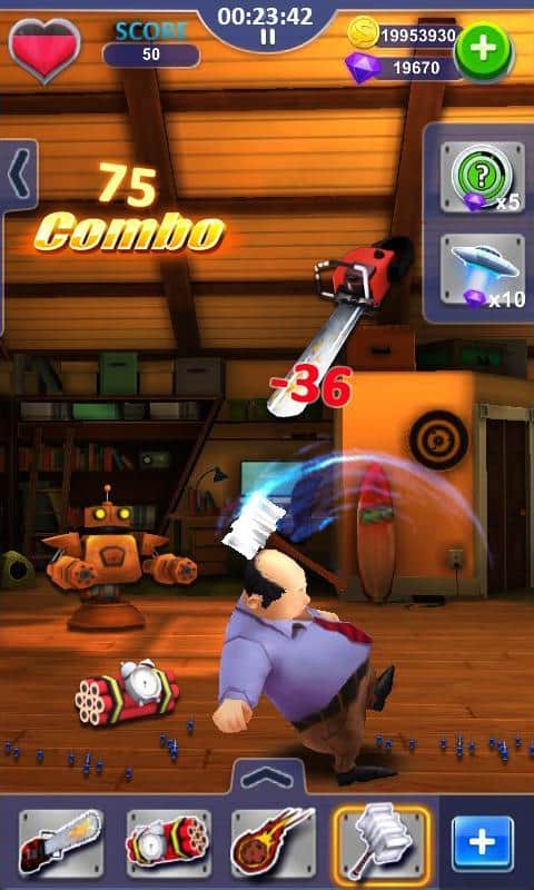 Whack the Boss – веселая игра на андроид, где вы сможете отомстить надоедливому боссу. Отомстите злому начальнику, который постоянно обижает вас, используя для этого различное оружие. Уничтожьте босса с помощью автомата, сюрикэтов, молотков, бейсбольных бит, бензопил, мечей и ракет и не давайте ему не единого шанса на спасение. Применяйте разное оружие и не забывайте комбинировать его, чтобы добиться лучшего результата и сокрушить босса. В этой игре представлено четыре босса, внешность которого вы сможете произвольно менять по своему усмотрению. Выдумывайте новые способы уничтожения босса и получайте оригинальные бонусы.