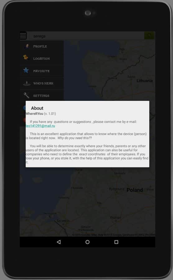 WhereRYou – с помощью этого нехитрого приложения вы всегда сможете понять, где в настоящее время находится устройство, на котором установлено это приложение. Теперь вы всегда сможете с точностью определить. Где в данный момент находится девайс и соответственно его владелец. Способы использования такого приложения масса. Например можно установить программу всем сотрудникам курьерской компании и координировать их движение. Можно использовать как средство персональной слежки и так далее. Если телефон у вас украли, то с помощью приложения вы всегда сможете определить его местоположение.