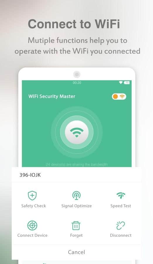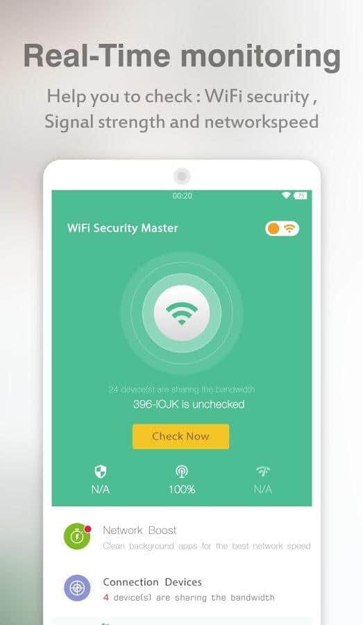 С помощью приложения WiFi Security Master ваша скорость соединения с интернетом будет намного быстрее, чем обычно. Мгновенно обнаружив сеть Wi-Fi, программа начинает сразу же сканировать все каналы подключенные к точке доступа и автоматически закрывает приложения в фоновом режиме для большей безопасности и ускорения работы. Посещение фишинговых источников здесь также исключено, приложение их блокирует, работая в безопасном режиме. Есть возможность протестировать соединение и устранить проблему с медленным сигналом.