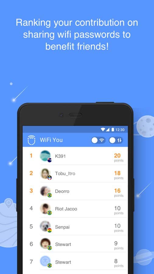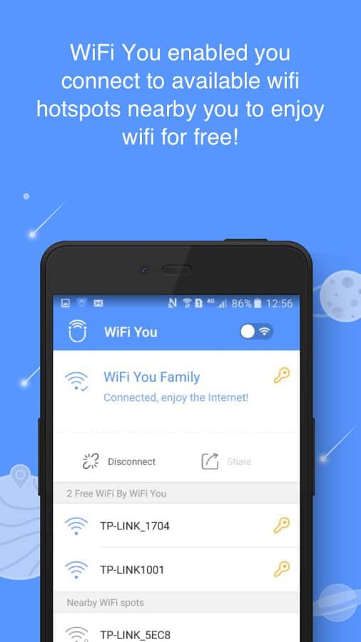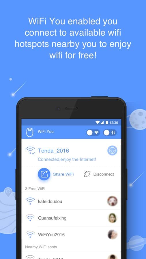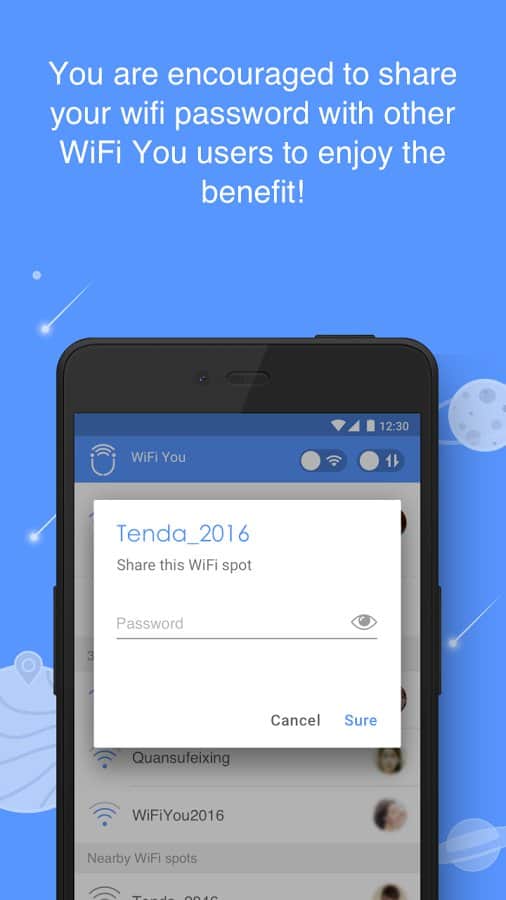 WiFi You-Free WiFi for Internet No password needed - Это очень необычное и весьма забавное приложение которое позволит вам пользоваться точками wi-fi не используя пароли! Вернее пароли то нужно будет использовать но вбиваться они будут автоматически. Данное приложение построено таким образом что люди могут делится паролями при этом не раскрывая самих паролей! Сейчас появилось множество заведения и общественных мест где есть wi-fi, и те кто знает пароль от этих точек доступа смогут раздать его всем пользователям данного приложения при этом не раскрывая сам пароль.
