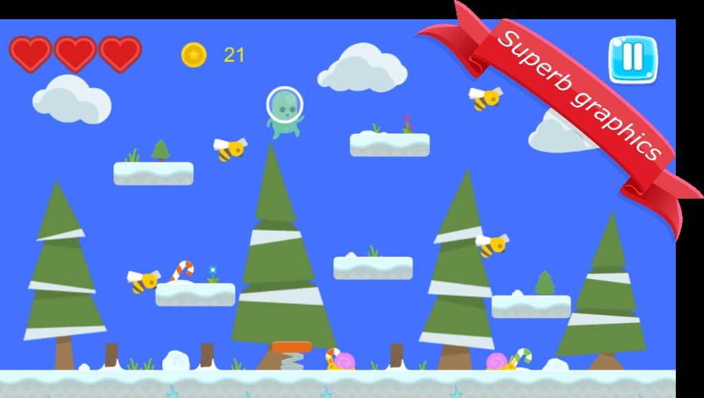 Willie Adventure World – аркада на андроид, где вы будете помогать пришельцу путешествовать по различным мирам. Наш герой Вилли приземлился на неизвестную планету для поиска сокровищ, помогите ему справиться с многочисленными врагами и собрать как можно больше монет. На каждом шагу нашего героя подстерегает опасность в виде на первый взгляд дружелюбных улиток и маленьких пчел. Прыгайте по специальным платформам и опасайтесь столкновений с врагами и препятствиями, дожидаясь удачного момента для прыжка. Постоянно следите за уровнем своего здоровья и собирайте специальную пищу, чтобы его пополнить.