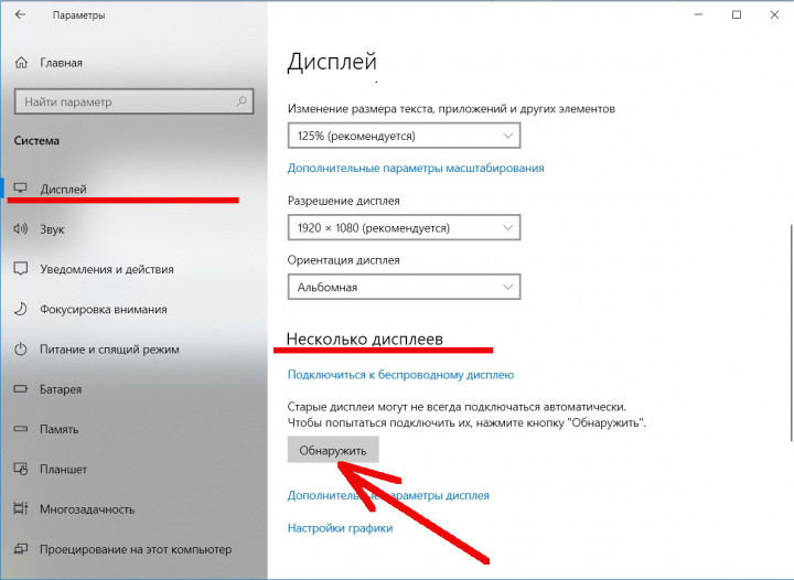 Чтобы проверить, как ваша система взаимодействует со внешним монитором, переходим по пути Пуск — Параметры — Система — Дисплей. Прокрутите меню до пункта “Несколько дисплеев” и нажмите на кнопку “Обнаружить”. Иногда этого достаточно, чтобы ваш ПК обнаружил подключенный внешний монитор.