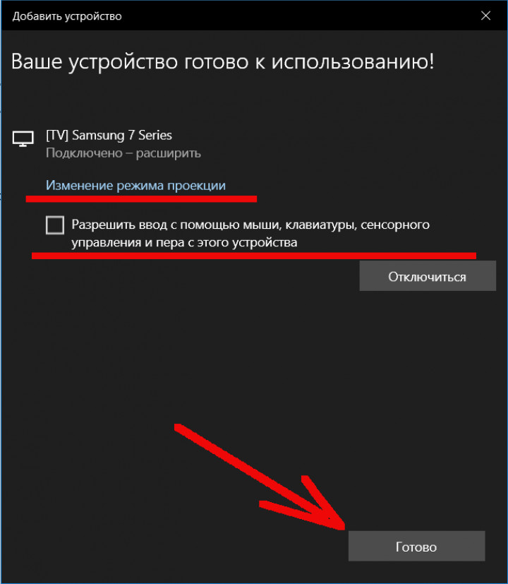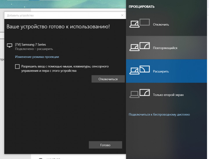 Далее на ПК нажмите Win+K и в представленном списке выберете то устройство, к которому хотите подключиться. В открывшемся окне можно выбрать, в каком режиме будут работать ваши мониторы (изображение может выводиться на один из них, или задействовать сразу два) и как будет реализован ввод данных.