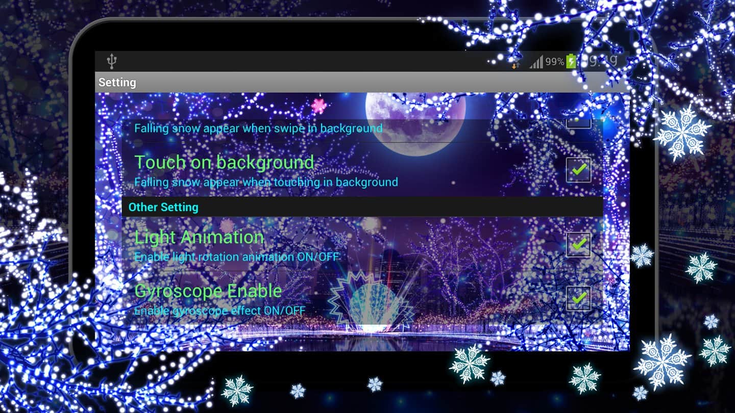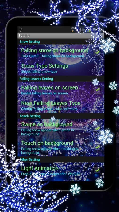 Winter Snow HD Live Wallpaper – красивые зимние живые обои на ваши андроид устройства. Перенесите зимнюю снежную сказку к себе в телефон или планшет и наслаждайтесь морозными узорами и падающими снежинками на экране. Если вы любите зимние снежные вечере, когда снежинки тихо падают на землю, а окна превращаются произведения искусства с замысловатыми веточками, то эти обои для вас с ними вы вдоволь насладитесь всеми прелестями зимы. Установите эти живые обои в свой девайс и наслаждайтесь предвкушением сказки и новогодних праздников, которые ожидают вас в этом году. Обои не займут у вас много памяти в телефоне и времени на установку.