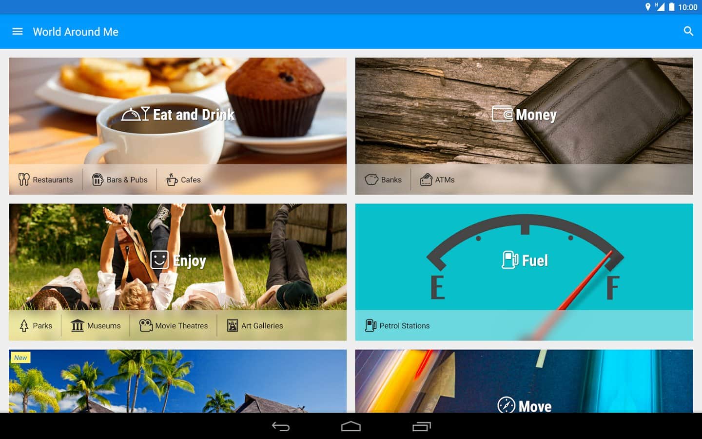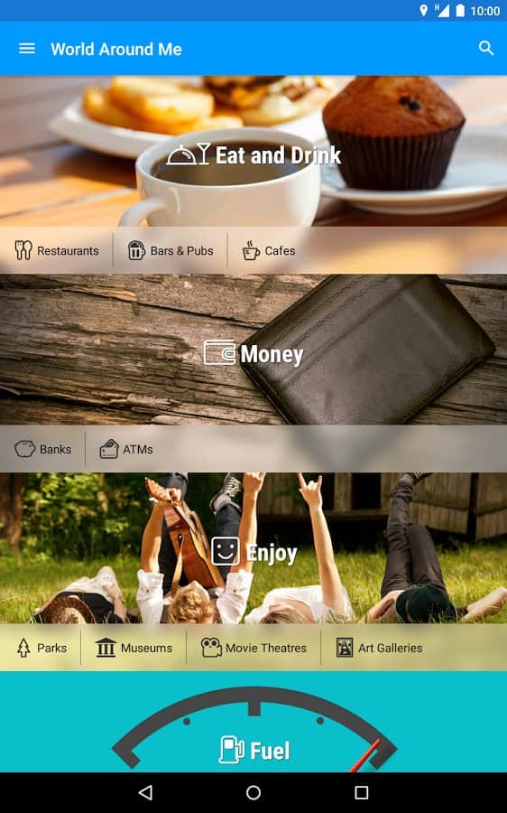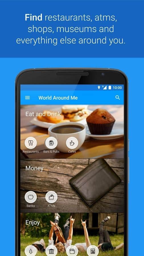 World Around Me - Уникальное приложение для путешественников. Здесь вы сможете определить, на какой дистанции находятся от вас, те или иные здания. Вы можете найти абсолютно всё. Просто выбрав нужный вам критерий поиска, и подняв телефон на уровень глаз. Просто вращайтесь, и смотрите по сторонам. WAM сочетает в себе передовую технологию дополненной реальности с беспроблемным, элегантным интерфейсом, который предоставляет полезную и увлекательную информацию по всем местам вокруг вас.