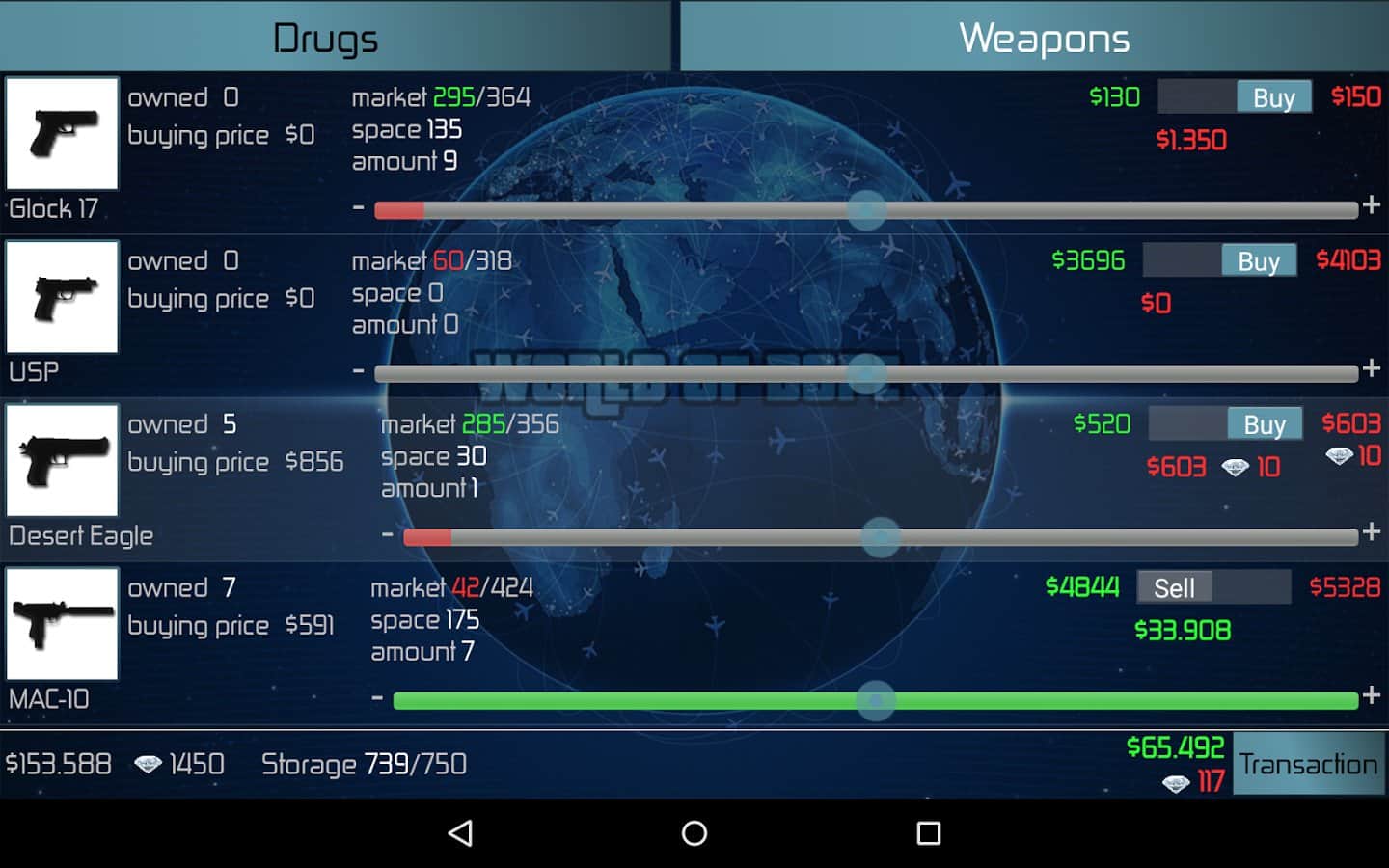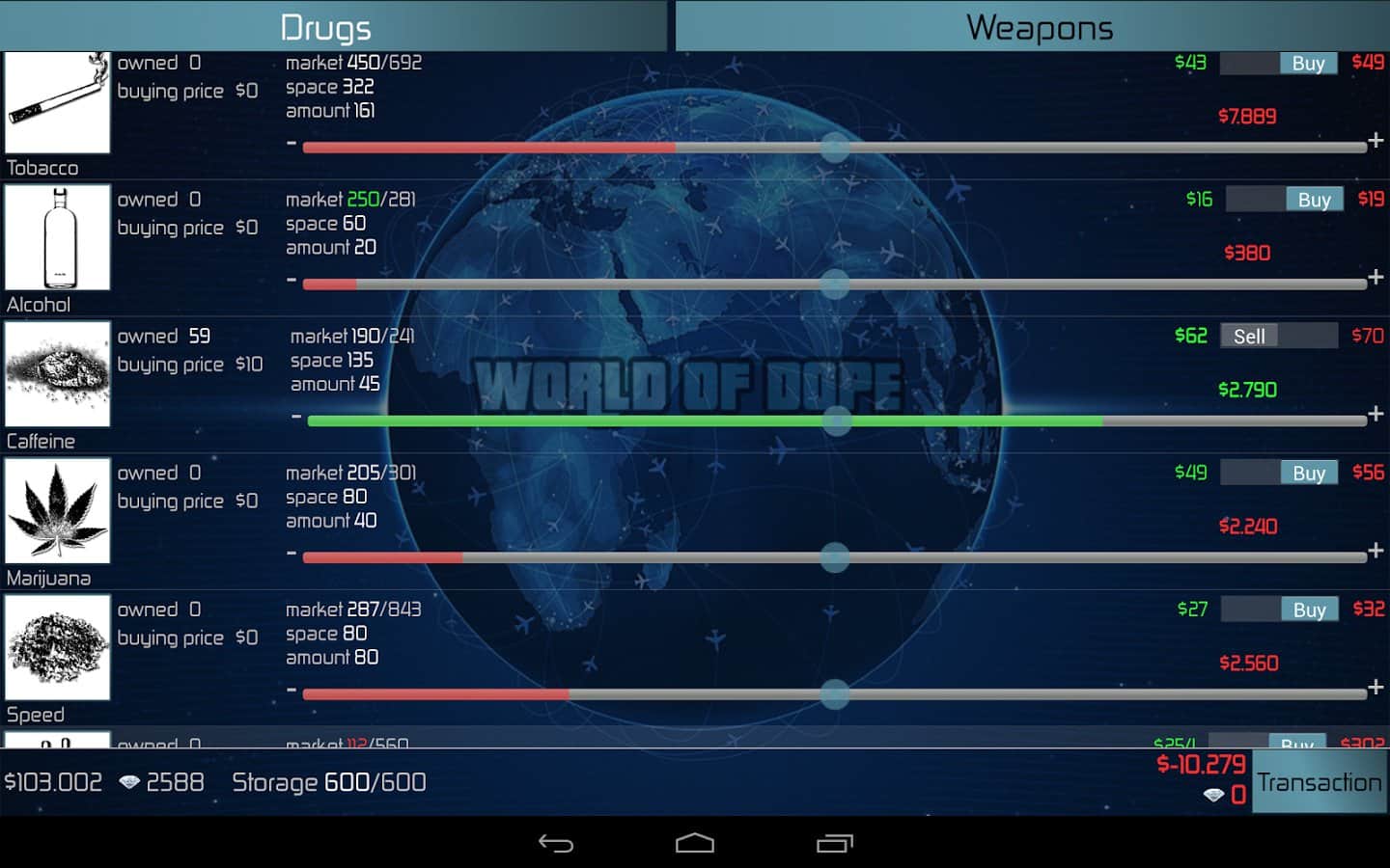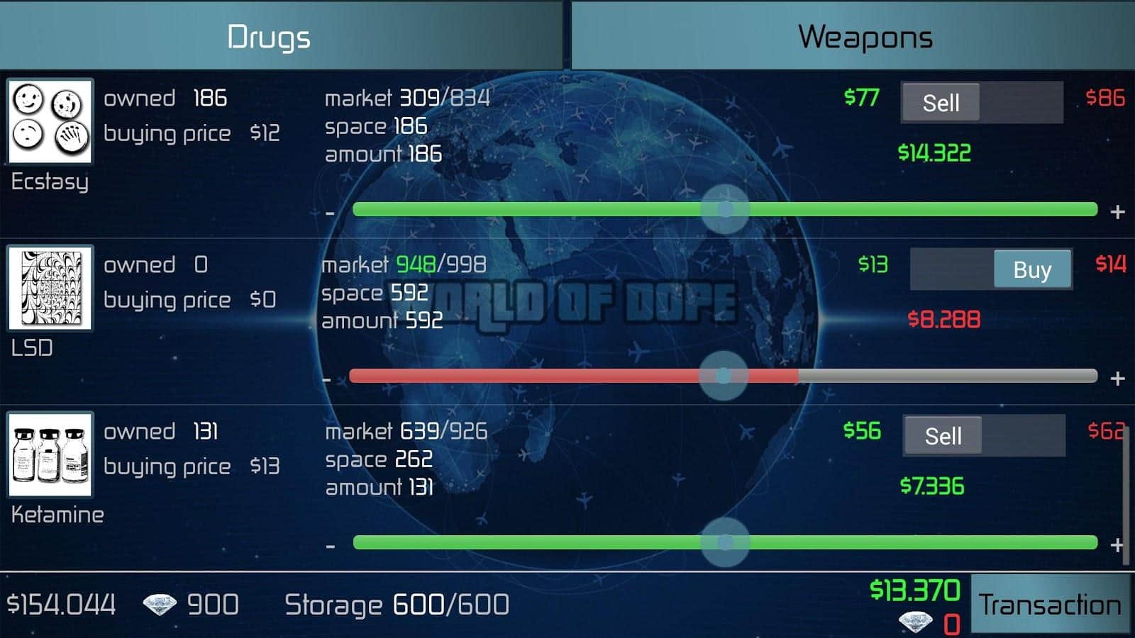 Наркотики - вещества которые с начала времен были неотъемлемой частью человеческой культуры и истории. С тех пор как наркотики перевели в ранг не законных веществ появилось масса людей зарабатывающих на их продаже баснословные деньги. Картели, синдикаты, нарко-бароны, кокаиновые короли все эти определения ассоциируются с огромными деньгами, но и с немалым риском. Конкурирующие группировки, наркоконтроль, федеральные службы это то же неотъемлемая часть наркоторговли. World of Dope - масштабная стратегия с элементами аркады, в которой вы сможете испытать свои силы в данном нелегальном бизнесе. Причем модель наркоторговли в игре выполнена довольно достоверно, более сотни городов, более 40 видов наркотиков, оружие, самолеты, автомобили, конкуренция и полиция все на месте.