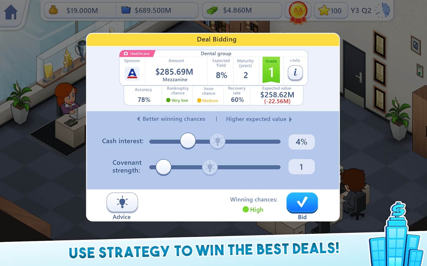 World of Finance - игра которая наверно в большей мере заинтересует людей далеких от сферы экономики, ведь данный проект позволит каждому опробовать свои силы в столь замысловатой науке, да к то муже получить массу знаний. Однако и профессиональные экономисты возможно будут не прочь испытать себя в реалистичном симуляторе своей профессии, ведь игровой процесс сочетает в себе как образовательные так и развлекательные элементы. И так, вы основатель и генеральный директор крупной финансовой компании. В вашем распоряжении определенная часть активов, которыми вам и придется распоряжаться стараясь приумножить прибыль предприятия. Но будьте внимательны, продумывайте и взвешивайте каждое вложение, нанимайте сотрудников и управляйте ими и тогда ваша фирма добьется еще большего.