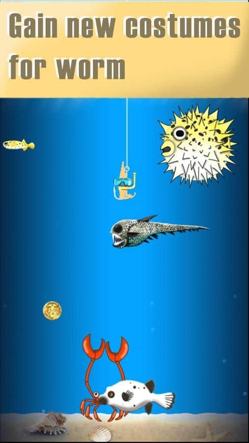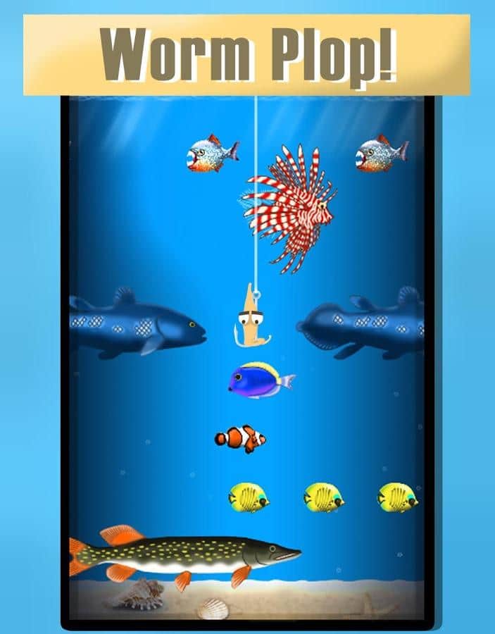 Worm Plop! catches fishes – увлекательная головоломка на андроид, где вы будете ловить различных рыб на червячка. Опускайте крючок с червячком в морские глубины и ловите редкие и ценные породы рыб. В этой игре сложность заключается в том, что вам необходимо выбирать нужный момент для погружения червячка и ловить ту рыбу, которую вы хотите. Всего в игре представлено более 20 видов реально существующих рыб, и все они имеют свои уникальные маневры и стиль поведения. Копите баллы и приобретайте для своего червячка новые костюмы и снаряжение. Касайтесь экрана в нужный момент, чтобы червячок погружался, останавливался или замелялся.