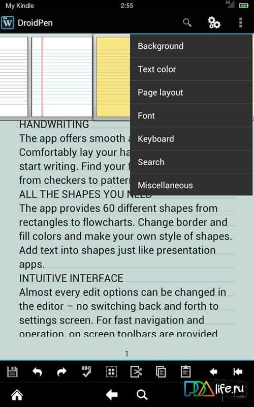 - Уникальный фон, шрифт, размер текста страницы, поля и межстрочный интервал настройки для каждой заметки