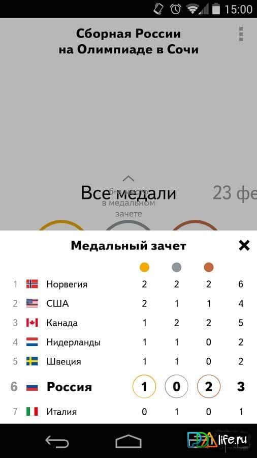 Яндекс Медали – отличное приложение на андроид для болельщиков за свою сборную в Олимпийских играх - Сочи. Данная программа в реальном времени оповестит вас приятным звоном монет о новых завоеванных медалях, однако информация об успехах доступна только для команд Украины, России, Казахстана и Белоруссии, все остальные же можно увидеть в меню Медальный зачет. Простота интерфейса, возможность порадовать друзей новыми победами сборной, оповещение даже в спящем режиме – все это непременно станет отличным дополнением к возможности быть в курсе происходящего на Олимпийских играх.