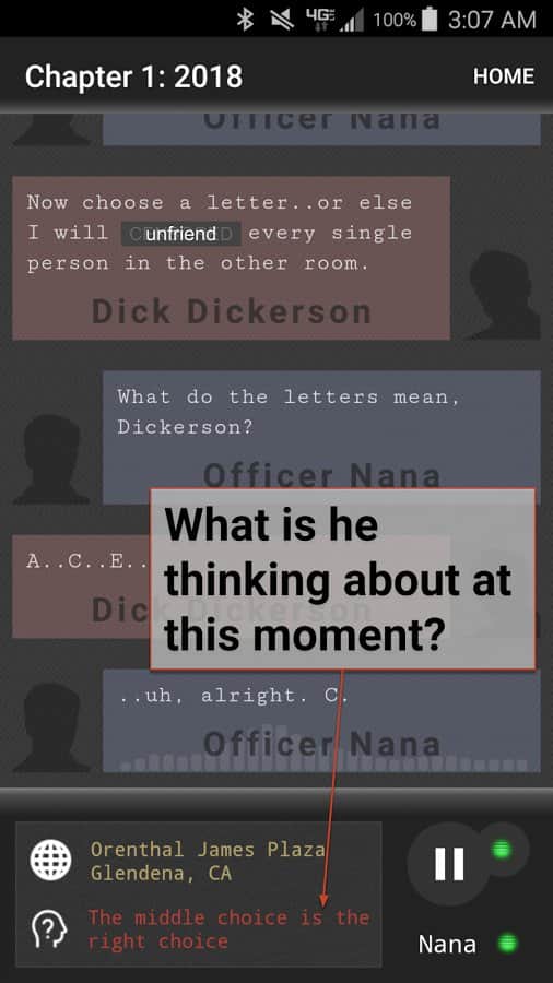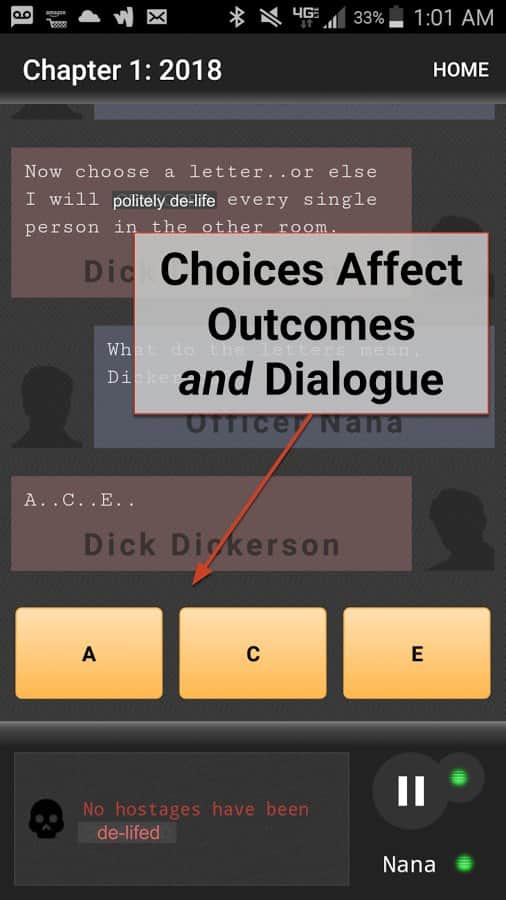 Year 2053 (Text Adventure w/Audio) – увлекательная интерактивная игра на андроид, где вы будете решать судьбу заложников. Дик Дикерсон взял заложников и у него очень плохое настроение, чтобы вести переговоры с полицией. В этой игре вы будете выступать как новый сотрудник полиции которому поручили ответственную миссию вести переговоры с преступников для того чтобы освободить заложников. Ваши вопросы и ответы будут на прямую влиять на дальнейший сюжет игры, а также на форму и содержание продолжающегося диалога. Тщательно продумывайте каждый свой ответ, ведь от этого будет зависеть судьба попавших в заложники людей. Придержите свои эмоции для того чтобы добиться хорошего результата в этой игре.