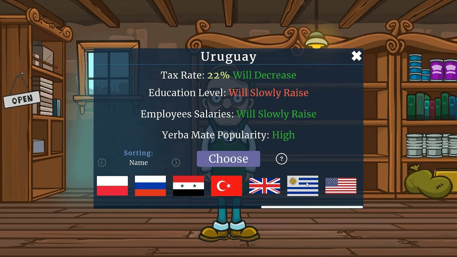 Приготовьте национальный напиток Уругвая, Аргентины, Парагвая и продвигайте свой продукт на территориях собственной страны! Йерба матэ славится альтернативой кофе, где есть возможность добавить больше 156 интересных добавок, которые колоссально меняют весь вкус этого удивительного напитка. Принимайте большое количество важных решений для своего бизнеса, разработайте дальнейший план магазина, покупайте новые компании, повышайте популярность своего заведения, улучшайте купленное оборудование и продавайте с высоким результатом!
