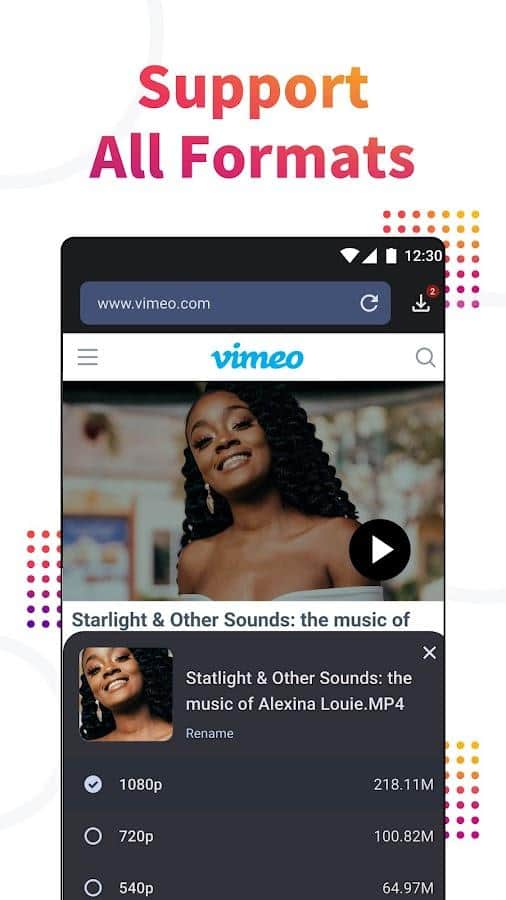 Загрузчик видео - Скачав это приложение, вы автоматически получаете доступ ко всем видеороликам, которые расположены на выбранном сайте, где вы находитесь. Просто зайдите на страницу, с какого надо загрузить видео, а затем сделайте это и получите файл в одном из доступных форматов: mp3, m4a, mp4, m4v, mov, avi, wmv. У вас есть возможность загружать не только видеодорожки, но и аудиофайлы в автономном режиме. Благодаря браузеру, вы можете легко перемещаться между страницами, скачивать любые видео и использовать их в своих целях.