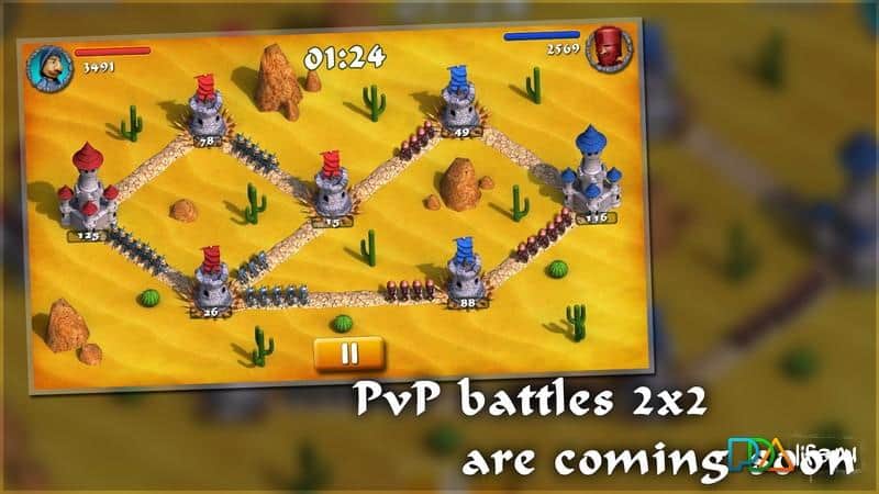 Завоеватели - становитесь во главе вашей бесстрашной армии. Используя свои тактические навыки, разгромите своего врага в пух и прах и захватите его замки. Захваченные владения необходимо удерживать любой ценой. На игровой карте расположено несколько ваших замков и башен, между которыми можно передвигать своих солдат. Вы можете нападать сразу несколькими группа на разные замки или сосредоточить всю мощь на одном укреплении. Решайте и действуйте!