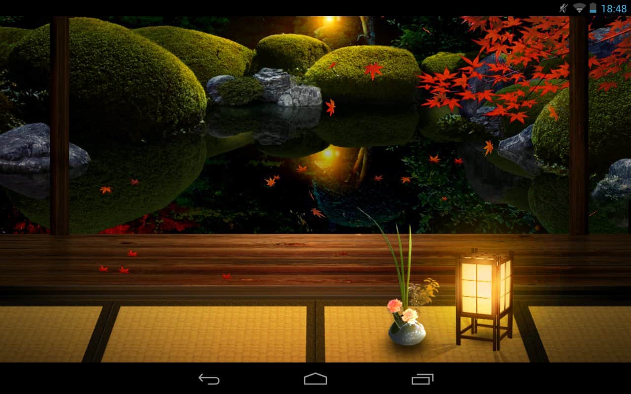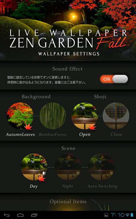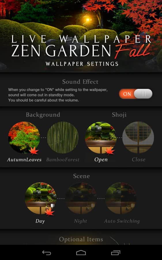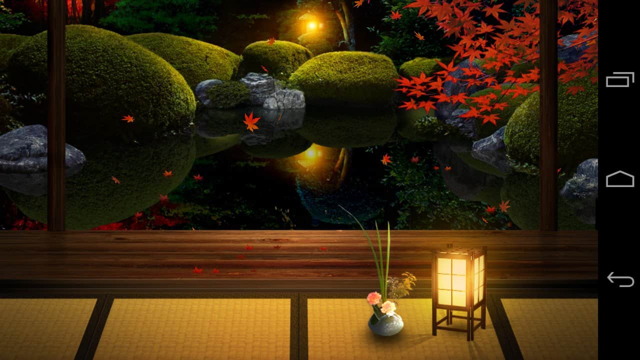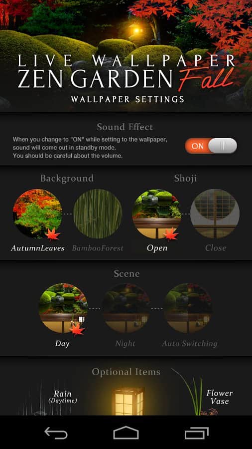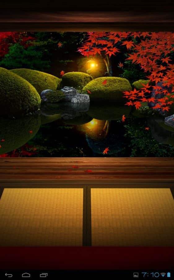 Zen Garden -Fall- LW – красочные живые обои для андроид устройств с красивой осенью в японском саду. Здесь вы услышите звуки капель дождя, песнь колокольчика от дуновения ветра и многое другое. Почувствуйте энергию Ки. Прикоснитесь к вечности!