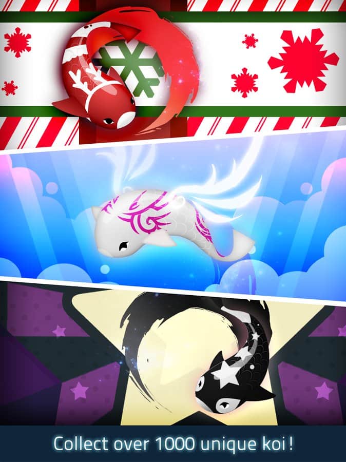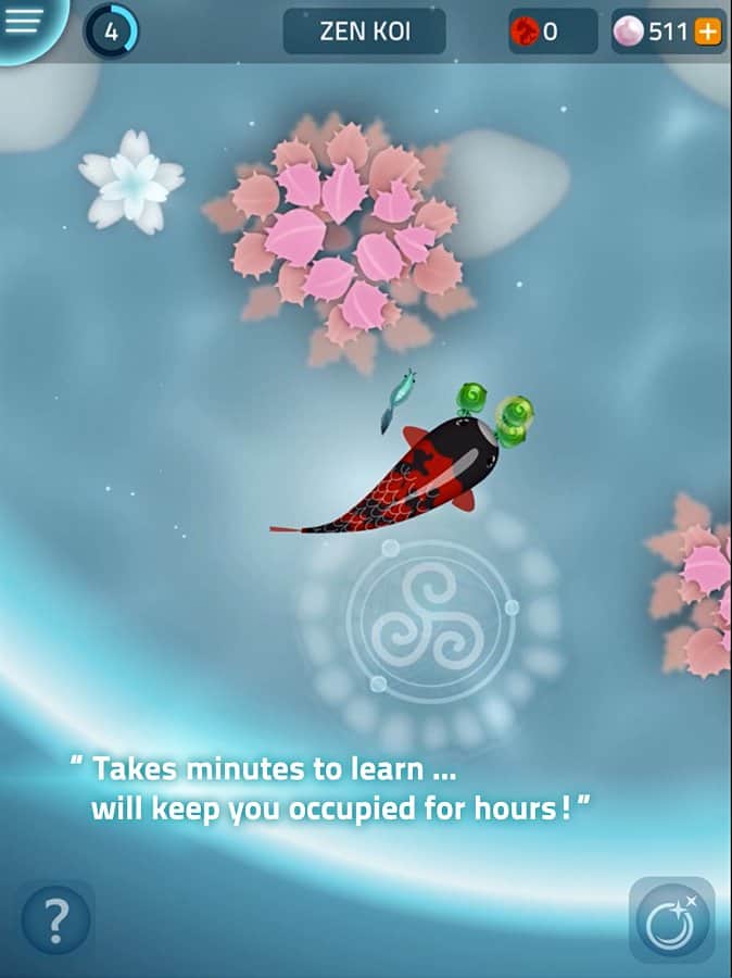 Zen Koi – Расслабьтесь, вы маленькая китайская рыбка, и ваша задача поедать других рыбок. Данная игра, весьма проста, но очень интересна. Она расслабляет вас, своей музыкой и не сложностью задания. После того как вы соберете несколько определенных представителей каждого вида, то сможете создать предмет, а он в свою очередь увеличит радиус вашего озера. Чем больше ваше озеро, тем больше представителей разных видов вам нужно поймать. Вы так же можете прокачать свою рыбку, увеличивая одну из трех доступных характеристик. Ещё стоит заметить, что к разным рыбам, нужен разный подход. Есть те к которым можно подплывать только сзади, или же очень быстрые рыбы, которых нужно выжидать в определенных местах.