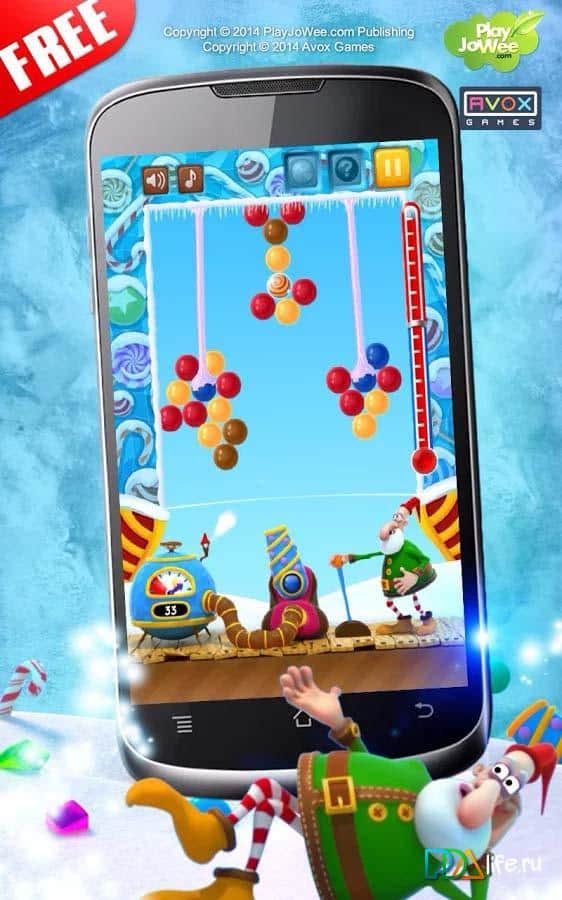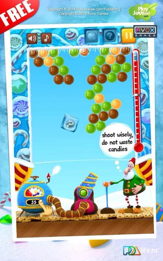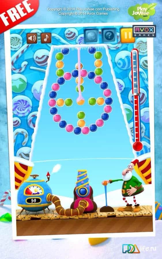 Зимний Леденец Bubble Shooter - весёлая аркада на андроид ,в которой необходимо очистить уровень от всех сладостей находящихся на нём. Для этого стреляем из пушки конфетками разного цвета и стараемся собрать несколько леденцов одного цвета, после этого они исчезнут. Будьте внимательны, так как количество выстрелов у вас ограничено. У вас есть шанс заработать золотую звезду, для этого необходимо сохранить четверть всех конфет и она ваша.