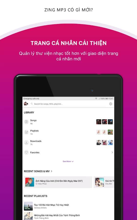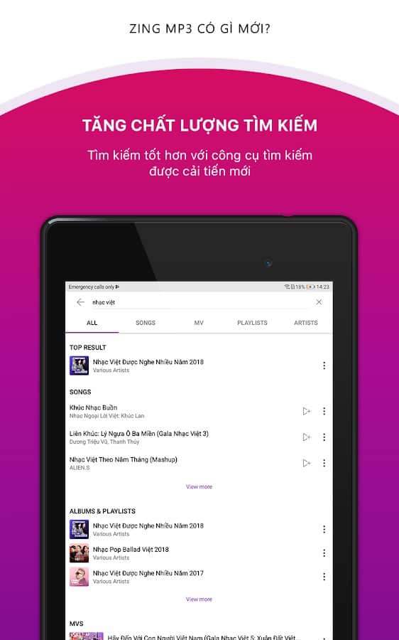 Вы активный слушатель музыки и ищите удобное и функциональное приложение для этой цели? Тогда попробуйте скачать бесплатную программу Zing MP3 для Вьетнама. Музыкальный плеер поддерживает самые популярные аудио форматы, обеспечивает быстрый доступ к приложению при помощи виджеты на экране. Управляете функциями себе на панели инструментов, получайте уведомления, управляете треками прямо в наушниках, регулируйте громкость и басы эквалайзера, делитесь песней по Bluetooth, балансирует звук, пользуйтесь таймером сна, настройкой низких частот и многое другое.