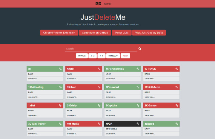 Сервис JustDeleteMe это не магическая кнопка, которая сотрёт все следы присутствия в Сети за вас. Это каталог, собранный волонтерами, список прямых ссылок на страницы удаления или инструкции по удалению аккаунта у сотен популярных сайтов. Заходим на официальный сайт, находим нужный сервис и переходим по ссылке, после чего взаимодействуем напрямую с тем сайтом, аккаунт в котором нужно удалить.