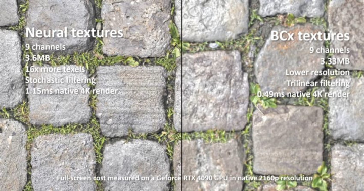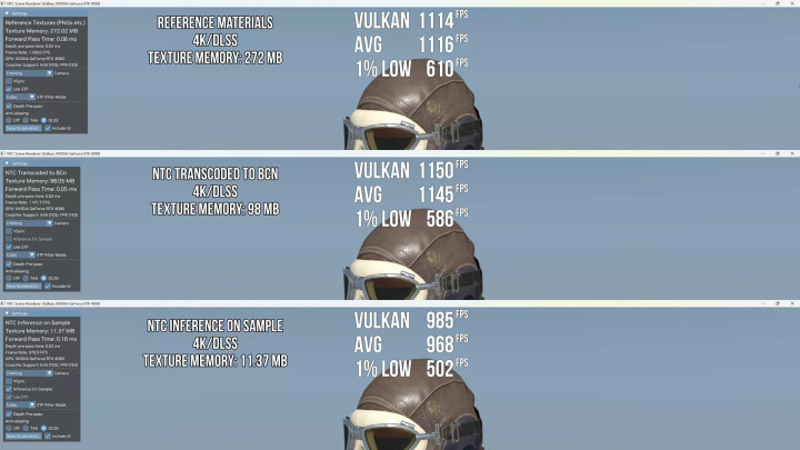 Для конечных пользователей NTC означает более детализированные и качественные текстуры в играх и приложениях при меньших требованиях к видеопамяти. Ресурс Compusemble уже смог протестировать бета-версию технологии в различных сценариях и получил впечатляющее уменьшение размера текстуры памяти с NTC на 96% по сравнению с обычными методами сжатия. В бенчмарке использовалась видеокарта RTX 4090 с разрешением 1440p и 4K. Авторы обещают повторить тест, когда в их распоряжении окажется RTX 5090.