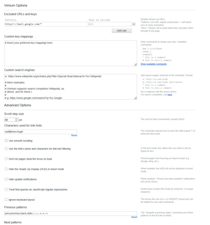 В разделе Options можно указать сайты исключения (Excluded URLs and keys) и настроить пользовательские сочетания клавиш (Custom key mappings). Полный список команд можно посмотреть кликнув на Show available commands.
