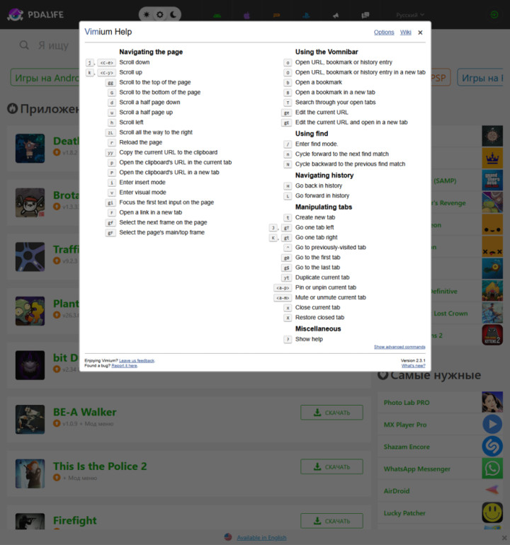 В Vimium два режима: обычный и режим ввода, в котором он не перехватывает клавиши. В нормальном режиме работают основные сочетания. Прокрутка страницы живёт на j и k, перемещение по горизонтали — на h и l. Быстрые прыжки в начало и конец страницы — gg и G. Есть обновление страницы, быстрый переход к закладкам, истории, восстановление закрытых вкладок, переходы ко вкладкам слева и справа или на первую и последнюю вкладку. Можно скопировать ссылку в буфер обмена, заглушить звук на странице, запустить поиск и другое.