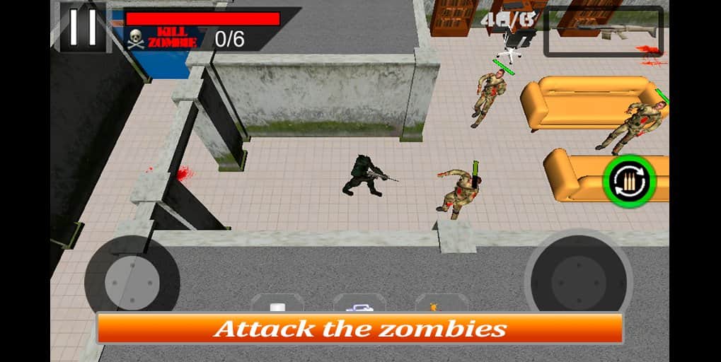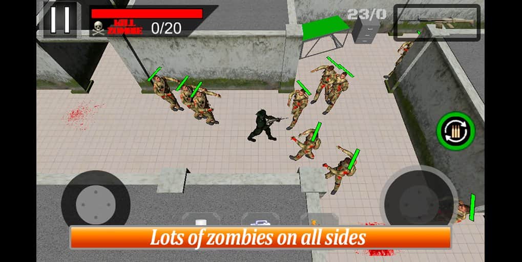 ZomB: Zombie in the base – зомби апокалипсис на андроид, где вы будете очищать военную базу от врагов. Возьмите под свой контроль военного и поместите его в самую гущу событий, где его со всех сторон будут атаковать ходячие мертвецы. Выбирайте среди большого арсенала оружия то, которое придется вам по душе и продержитесь как можно дольше в этой игре. Впереди вас ждет встреча с тремя видами зомби, одни будут ходить, другие бегать, а третьи даже стрелять. Перемещайтесь по помещениям и коридорам военной базу и зачищайте ее от зомби. По пути собирайте многочисленные бонусы в виде бомб, мощного оборудования и аптечек.