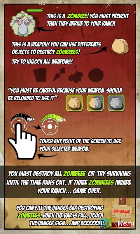 Весёлая игра для windows phone 7 за фермера. В один ясный день Вы просыпаетесь и направляетесь на свою ферму, покормить ваш скот: коров, телят, овец и других. И вдруг Вы видите, что овцы обратились в зомби и пытаются напасть на Вас, отобрать весь корм, а может даже и поужинать вами. Защищайтесь как только сможете! и возможно останетесь в живых.
