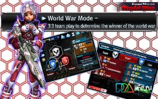 Zombie Master World War - это он-лайн шутер, в котором принимает участие весь мир! Примите и вы участие - смело вступайте в 7мидневную войну и получите награду по итогам недельной битвы! Очищайте территорию от зомби-вируса и не забывайте про отражение атак противника, периодически нападающего на вашу территорию. Если же вас все-таки уничтожили - не останьтесь в долгу - выпустите снаряд мести! Тренируйте свою армию, вооружайте бойцов и продумайте систему защиты. Летайте на вертолете или гоняйте на военном суперджипе - возможностей много! Ну а если вам надоело бегать и стрелять - вас ждут интереснейшие миссии.