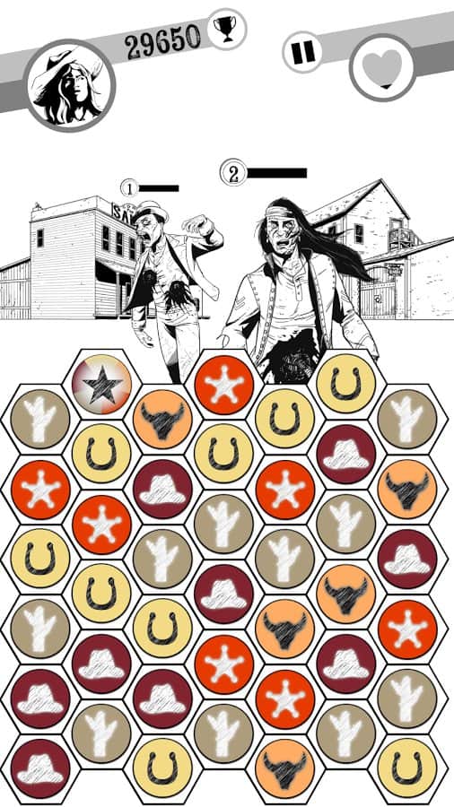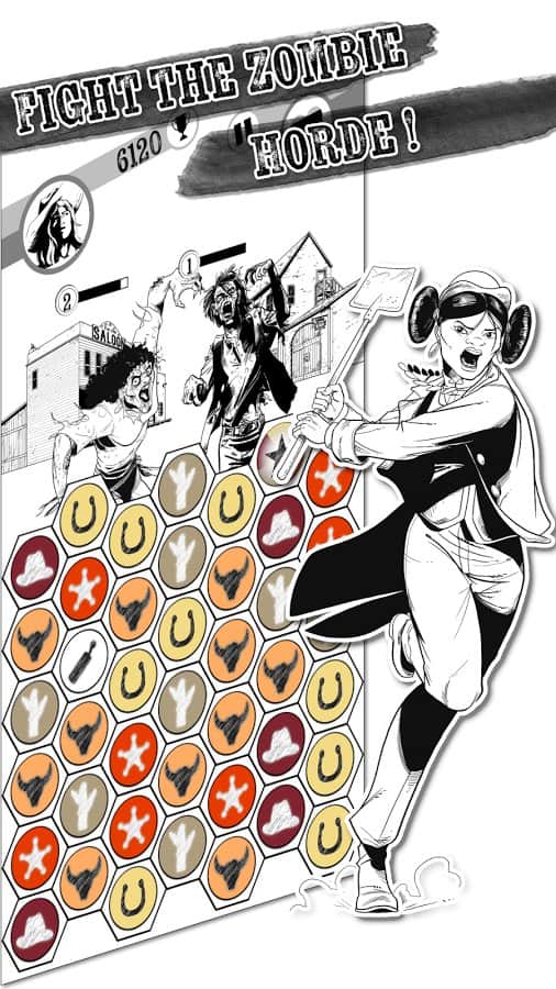 Zombie Match - аркадная головоломка из серии три в ряд с элементами ролевой игры. Прямо сказать подобных игр мы уже повидали вдоволь, однако разработчики Zombie Match взяв за основу популярную игровую механику придали ей массу оригинальных деталей. Начать стоит все таки именно с графического исполнения, сочетание монохромных фонов и ярких игровых деталей придает Zombie Match довольно эстетический вид. Особое внимание стоит обратить на общее исполнение игры, контент которой сочетает в себе элементы Дикого Запада, Древней Японии, а так же популярного сегодня сюжетного направления зомби апокалипсиса. Вам же отводиться роль шерифа небольшого городка, главная задача хранителя порядка принести мир на улицы города.